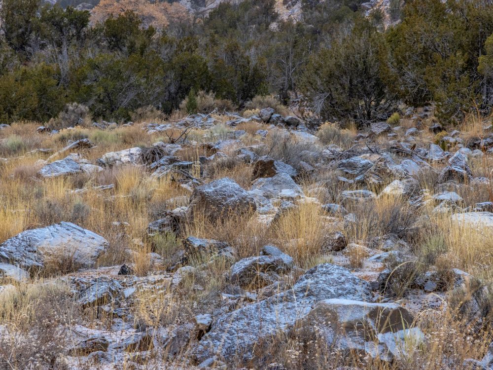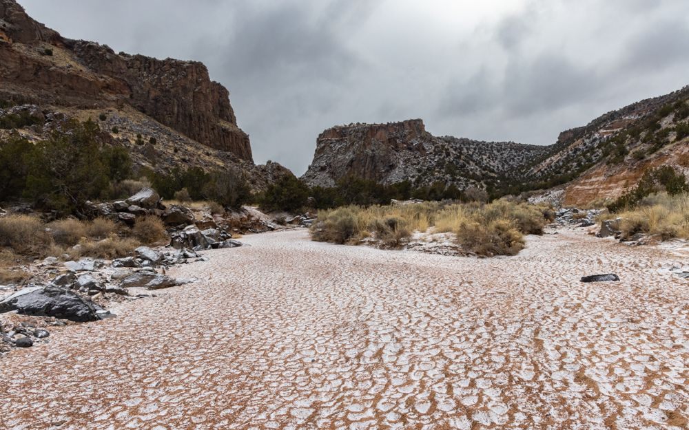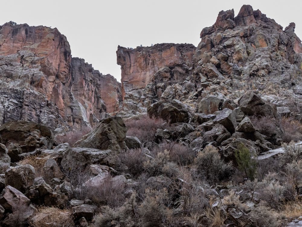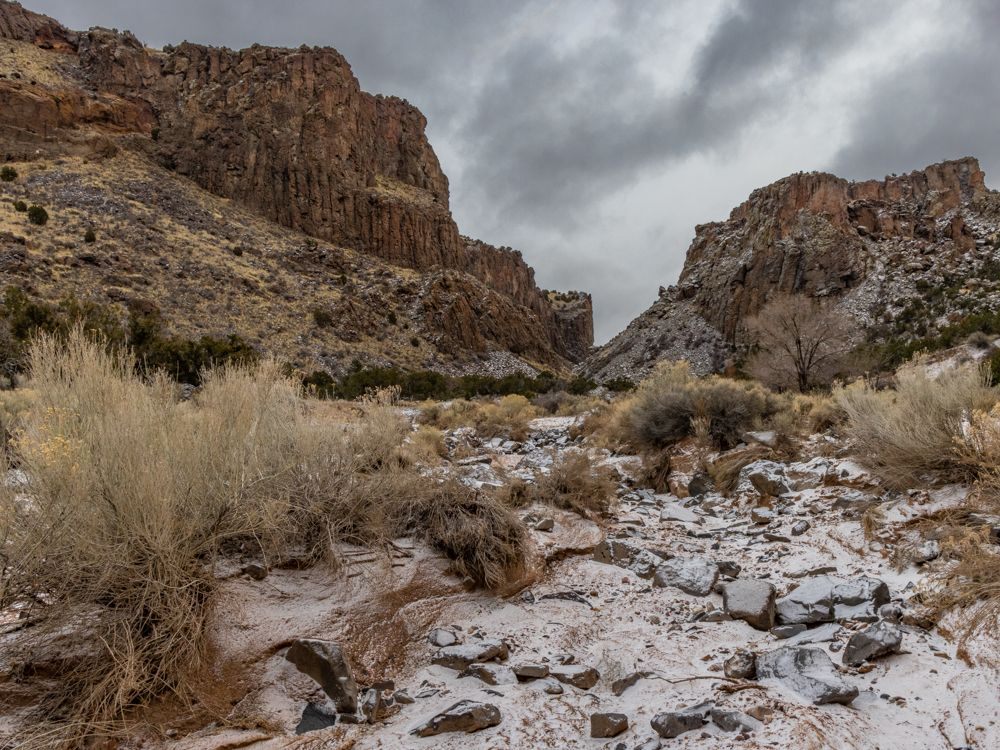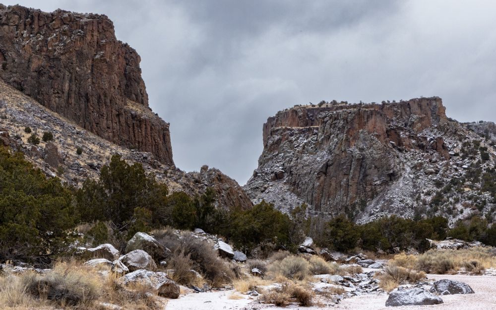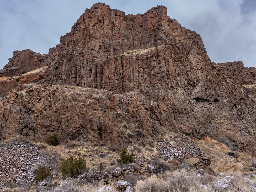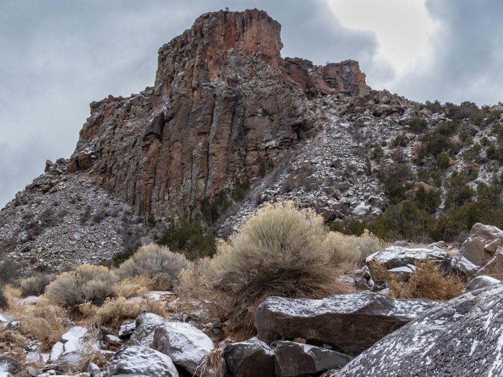 D & R recommended Diablo Canyon recreation area , an arroyo on BLM land with basalt cliffs rather than the more ubiquitous red sandstone. This is a flat hike over sand that, if one were to hike the 6 miles out and back would reach the Rio Grande river. When I arrived this morning, it was about 25 degrees F and snowing lightly. As the aphorism goes, there is no such thing as bad weather, only inappropriate clothing. Fortunately I was dressed for the weather and was quite comfortable. The other aphorism is that the best opportunity for great photos is during inclement weather. In this case, I think I would have preferred blue skies with puffy clouds (which arrived in the afternoon). But I did the best I could under the circumstances. I hiked out a mile and a half, at which point the basalt cliffs gave way to rolling hills, then turned around and hiked the mile and a half back out. On the way back I had cloudy skies and filtered sun, which provided some better opportunities to capture this particular landscape.