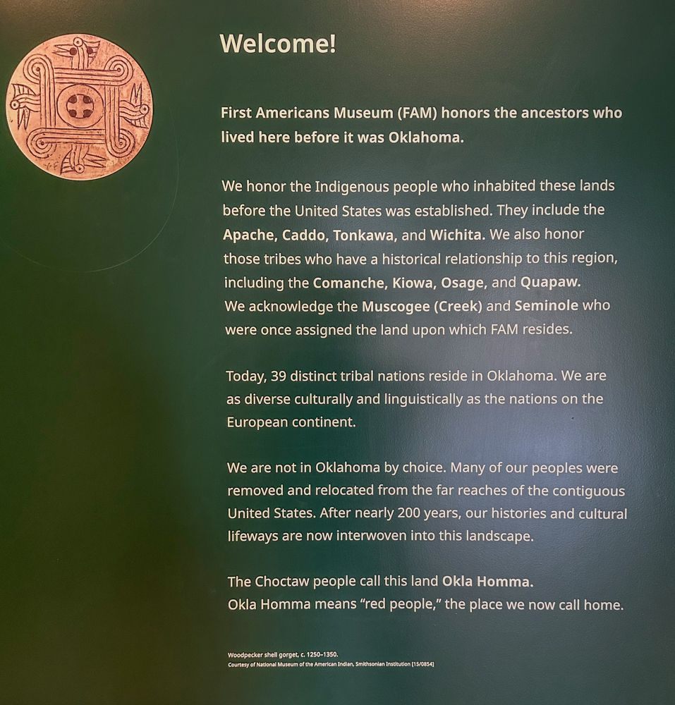 First Americans Museum (FAM) . This museum is very new; it only opened in 2021. To my knowledge, nothing like it exists anywhere else. It comprises two floors of extremely comprehensive and well-researched history. Many very well-done AV presentations and first person accounts. The introductory video presentation that references several origin stories is particularly captivating. Of course I am familiar with the general trajectory of the very sad and embarrassing treatment of First Americans by European Settlers, but the very raw and emotional presentations were extremely sobering. The whole second floor is devoted to a semi-permanent loan from the Smithsonian of First American artifacts.
