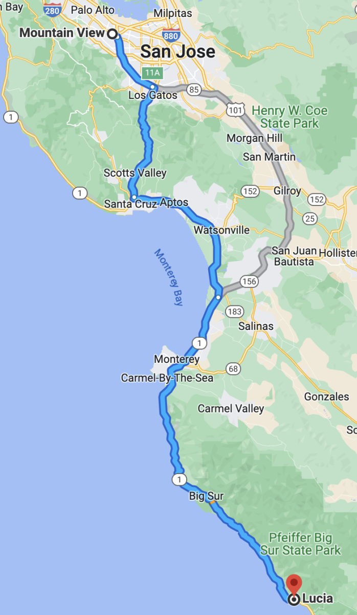 Fittingly, today was my first challenge. Mountain View to Lucia (just South of Big Sur) was supposed to be an easy first day drive, maybe 2.5 hrs. Unfortunately the road closures mentioned yesterday were between Big Sur and Lucia. Both Google maps and Waze agreed that I could drive South on a more inland route, the cut over to the coast and approach from the South. I got most of the way there only to find that the road to the coast was permanently closed with a locked gate. The reason remains a mystery (might be the subject of further research).