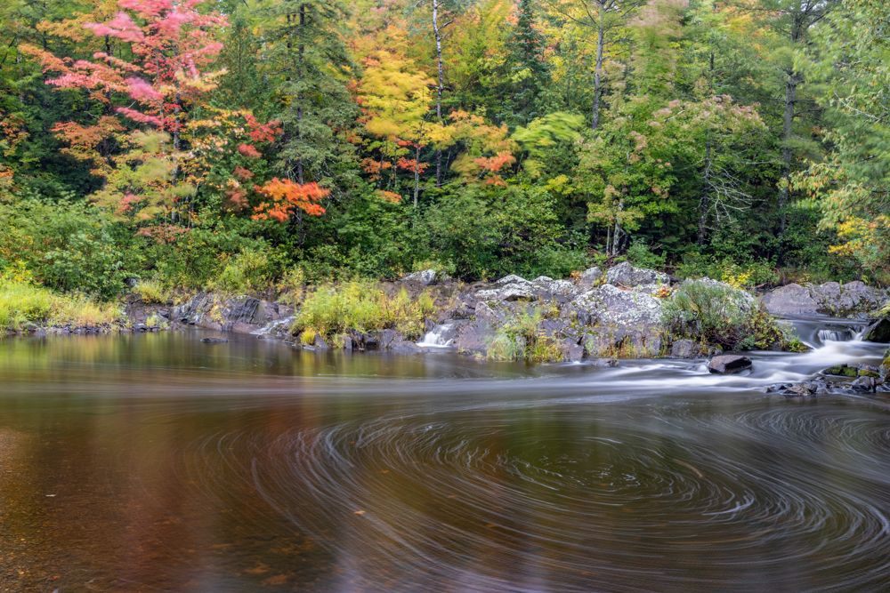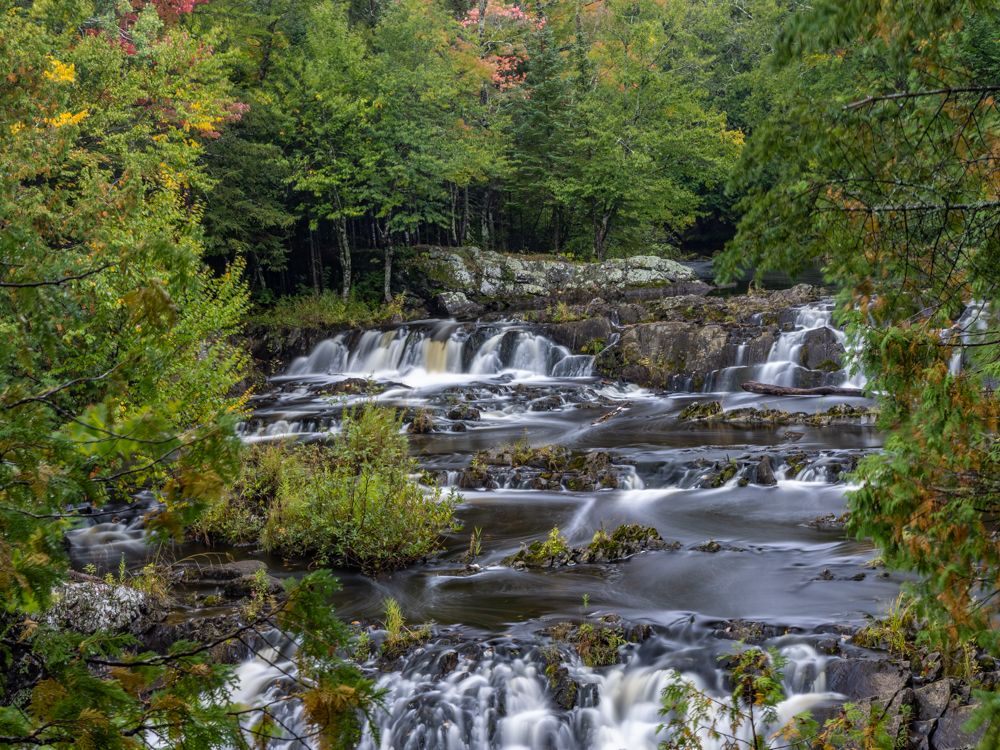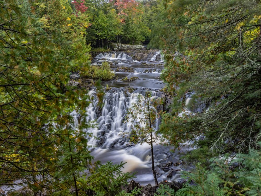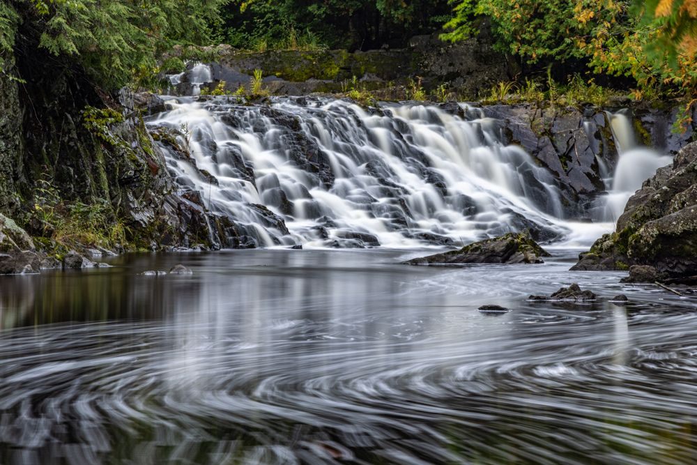 Upson Falls , located at the campground of the same name. Before walking down to the falls, I chatted with Stacy and Ryan who were camping in the area, but taking the opportunity to dry off in the campground shelter after the rain. Like the two falls I visited yesterday, Upson Falls required a bit more effort. The falls here in WI are smaller and more wild than the falls in the MI UP. The trails, if they exist at all, are frequently a scramble, and you have to work to get into position. That’s fine, it discourages the civilians. I went two pools deep into Upton Falls, then the footing, already wet and muddy, got a bit too rough for my liking. And I wanted to get to at least one other falls today.