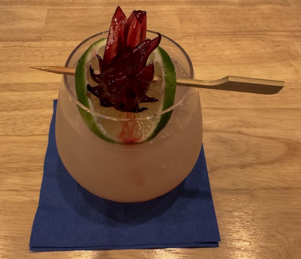 Mezcal Paloma - La Luna Mezcal, Fresh Squeezed Lime Juice, Grapefruit Juice, Soda Water, Hibiscus Flower, Lime Wheel, Tajin Rim
