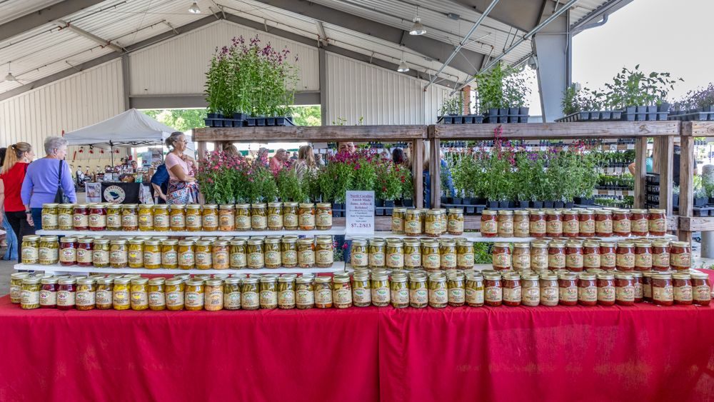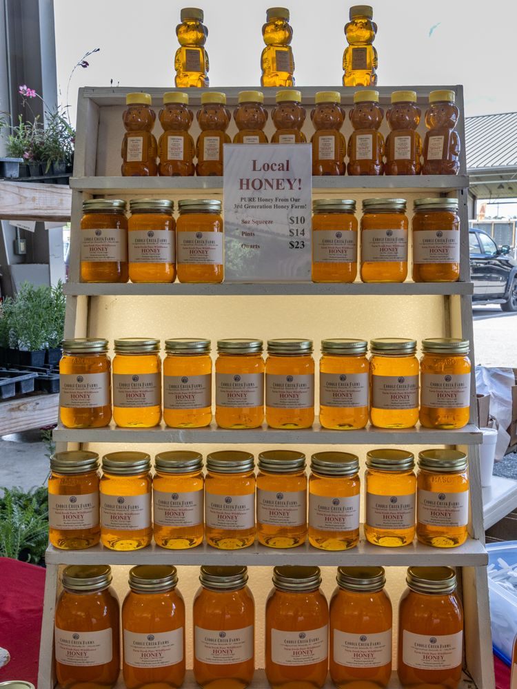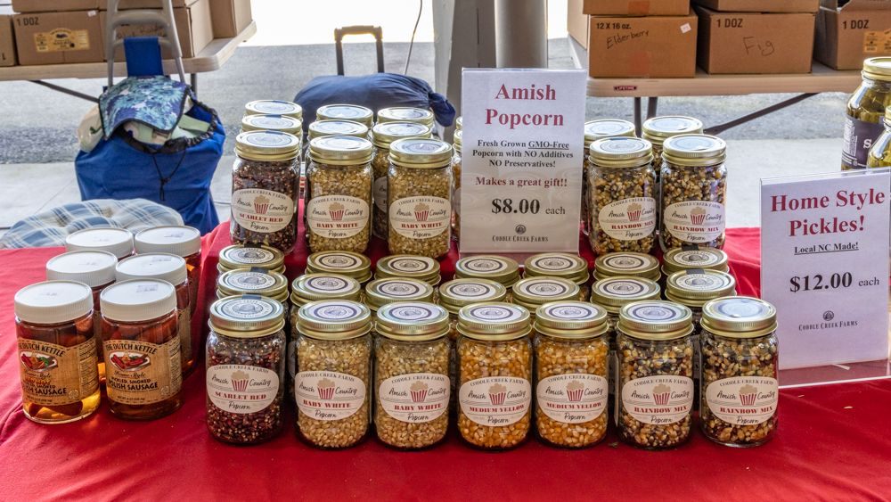 Coddle Creek Farms stand. Again, she asked me to mention that Steve is the owner. This stand offers a number of jarred and preserved items, some obtained from the Amish community. They had honey, peanut butter, Amish popcorn and many different kinds of preserves, all beautifully displayed. I purchased a small jar of yummy peanut butter to add to my snack choices. She offered me a discount, which I declined. These people work hard.