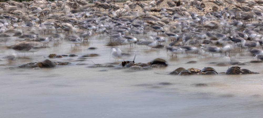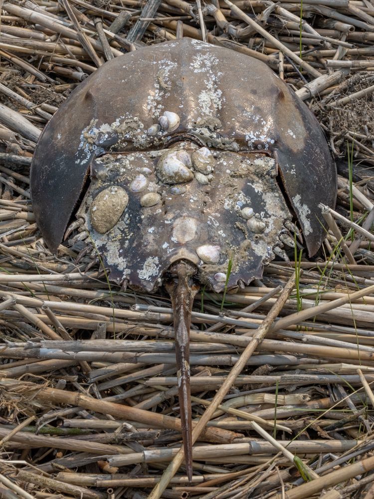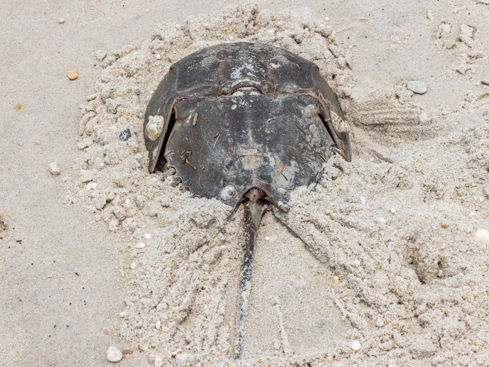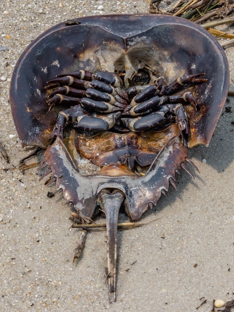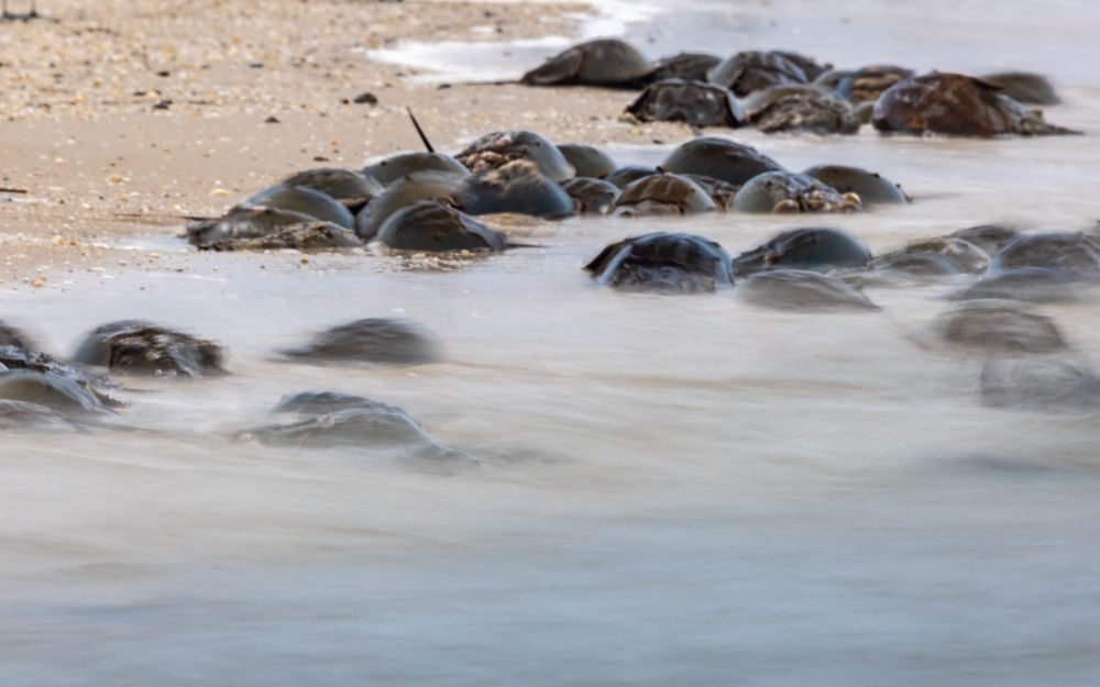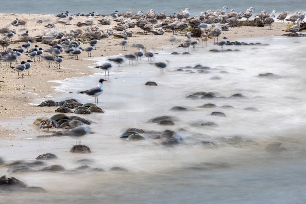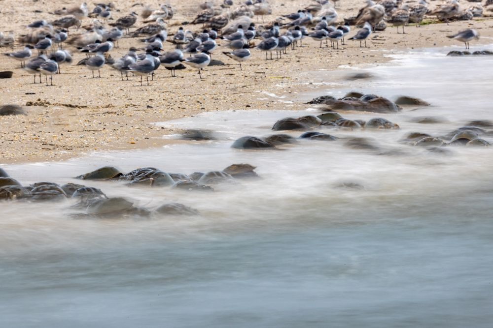 Cook’s Beach . This beach is famous for the horseshoe crabs that come ashore each year in the Spring to spawn. This also attracts an enormous amount of seabird and shorebird life that dine primarily on the roe, which is rich in fat. Fin fish and Sea Turtles also eat the roe, as well as the larvae. Yet other species live in and on the shell of the crab in a symbiotic relationship. The crabs themselves are an interesting species as they are