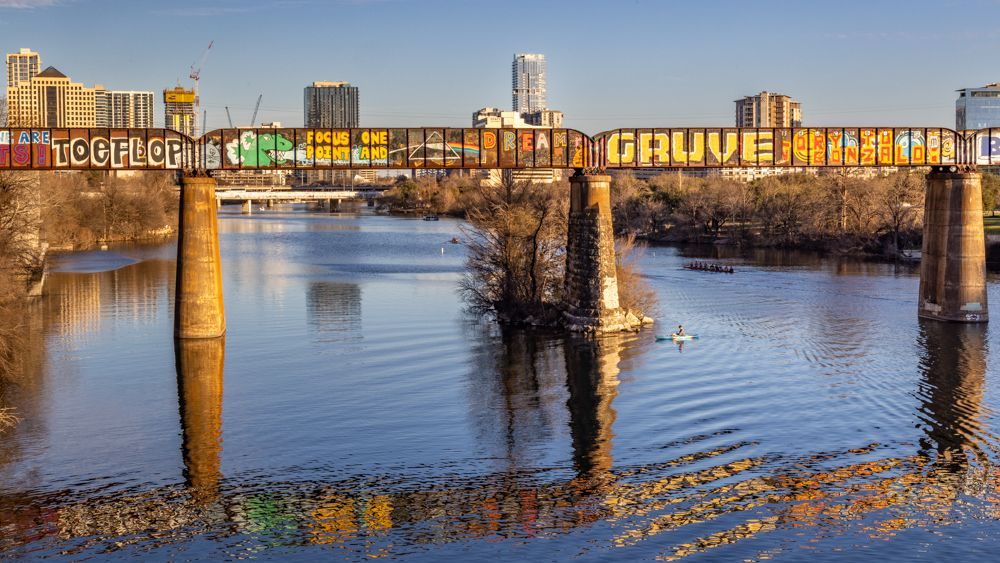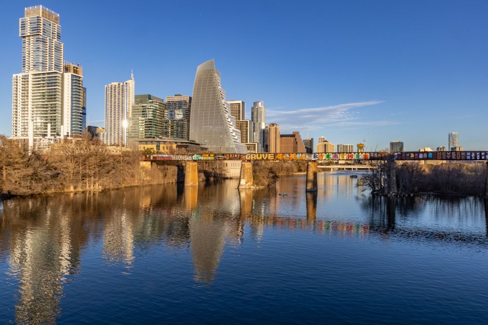 Train bridge and skyline, from the Pfluger pedestrian bridge in Austin