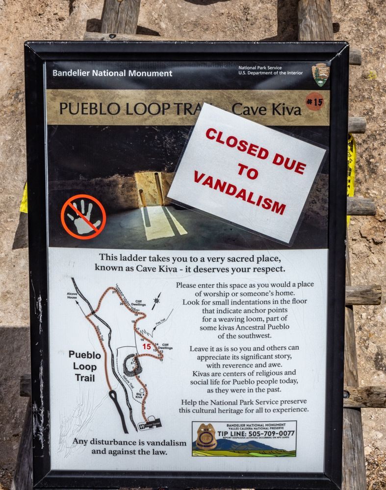 I first walked the main Pueblo trail, which is where many of the cliff dwellings and other archeological remains of the Pueblo people can be viewed. Sadly, Cave Kiva was closed due to vandalism. Rachel, from the park service, explained that it had been defaced by graffiti. This is unfortunately a common occurrence at archeological sites all over the world. It is difficult to understand the motivation, or perhaps just lack or appreciation required to commit such an act.