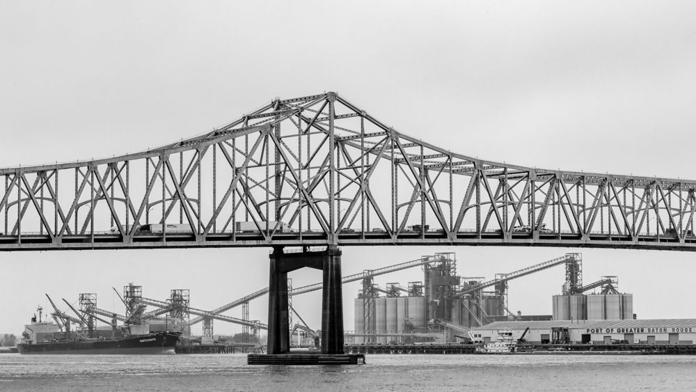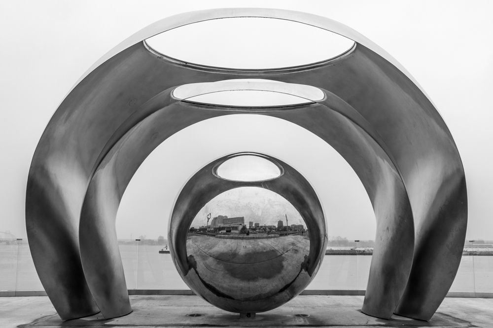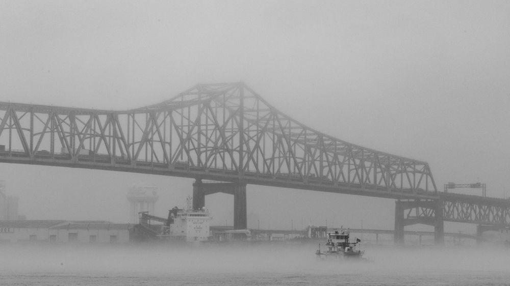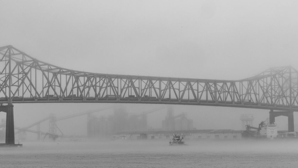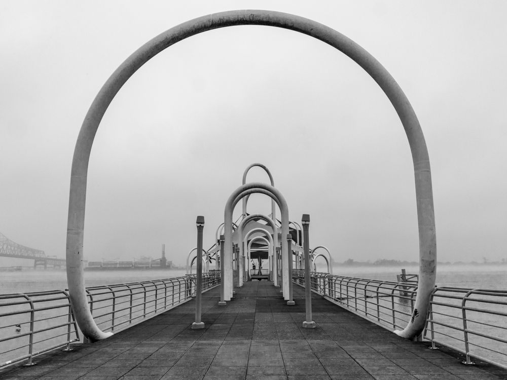 Mundane tasks taken care of, I walked the few short blocks down to the Mississippi River. It was still foggy, but starting to thin. The river is very wide here and Baton Rouge is an active commercial port. I saw a number of very long freight ships. And the train tracks parallel the river - you have to cross them to get from town to the Riverwalk. At the entrance to the Riverwalk is a reflective structure similar to the Chicago Bean. I had some fun taking distorted reflections of the river and the barges.