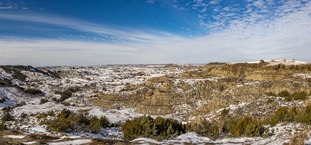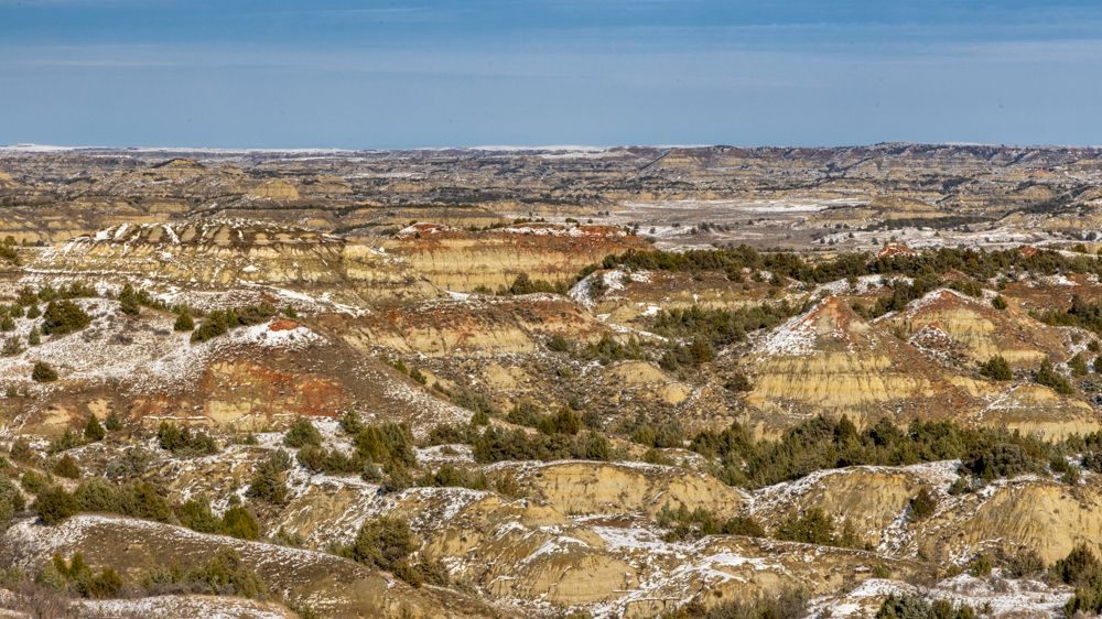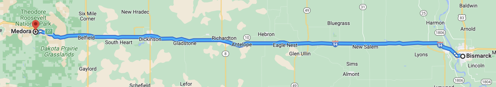 This morning I drove to Medora, where I will have a few days to explore Theodore Roosevelt National Park as well as some of the surrounding areas if I have time. I drove most of the way in a white-out. This seems to be a common phenomenon in this part of the country. By the time I arrived it had resolved to clouds and overcast. I’m now back on Mountain Time. However this park actually splits time zones; the south unit is in the Mountain time zone and the north unit is is back in the central time zone.