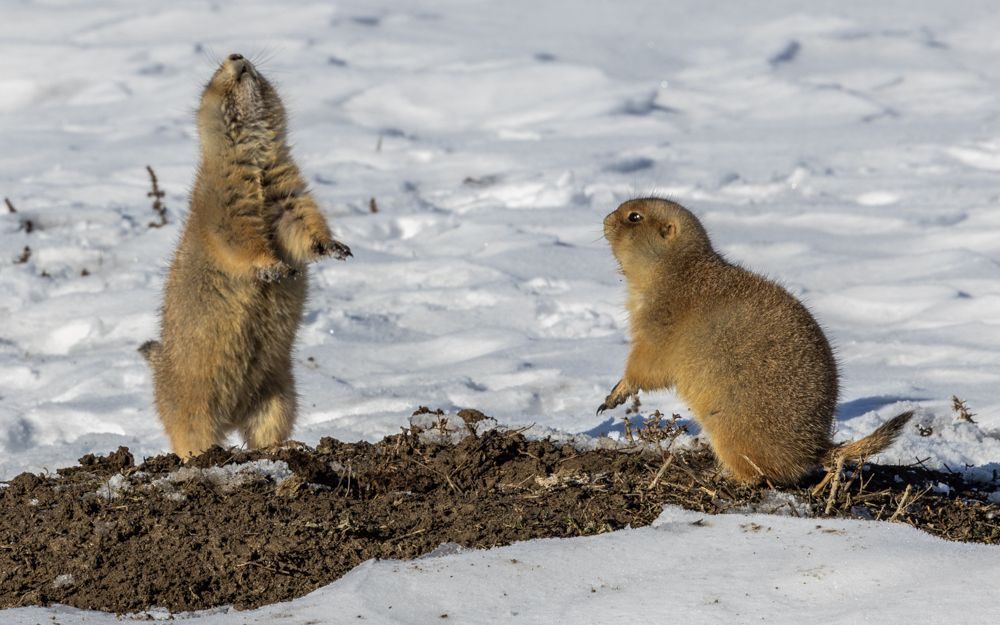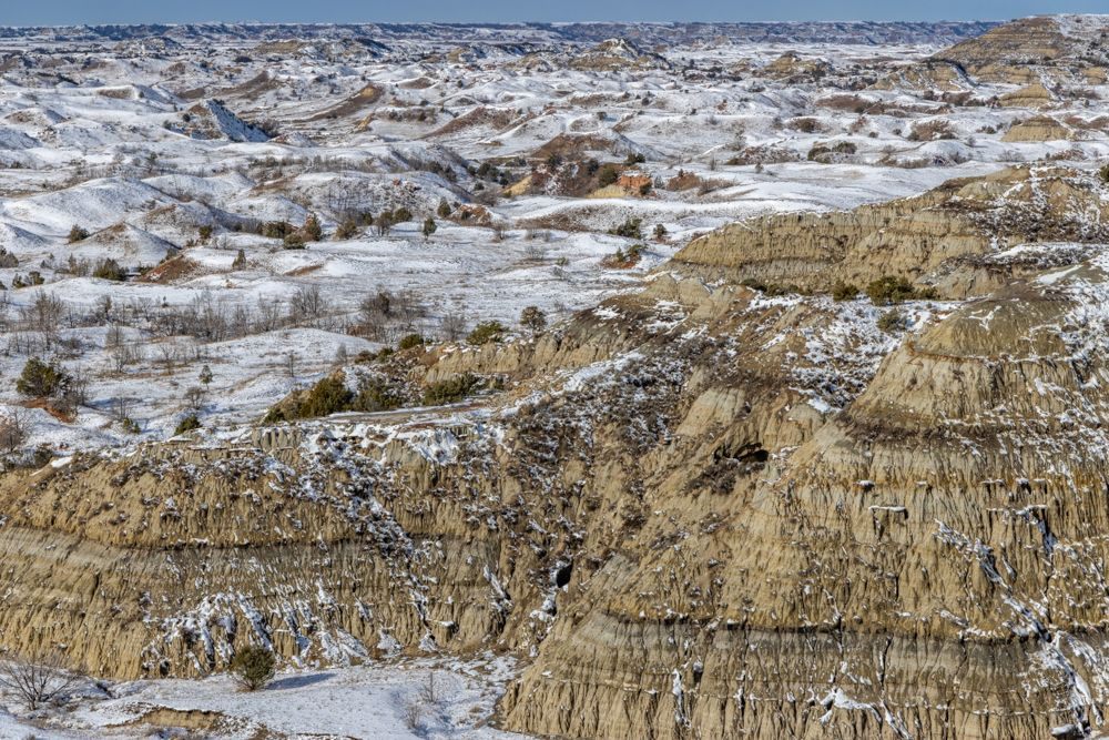 When I checked in at the south unit visitor center, I was told that about a quarter of the loop was closed for road construction. And of course it is the part that contains the iconic badlands overlook. The advantages of visiting a popular location in the off-season is a death of visitors - I saw maybe three cars the entire time I was there - and the possibility to experience snow on the rock formations. The disadvantages include road and trail closures due either to weather or construction.