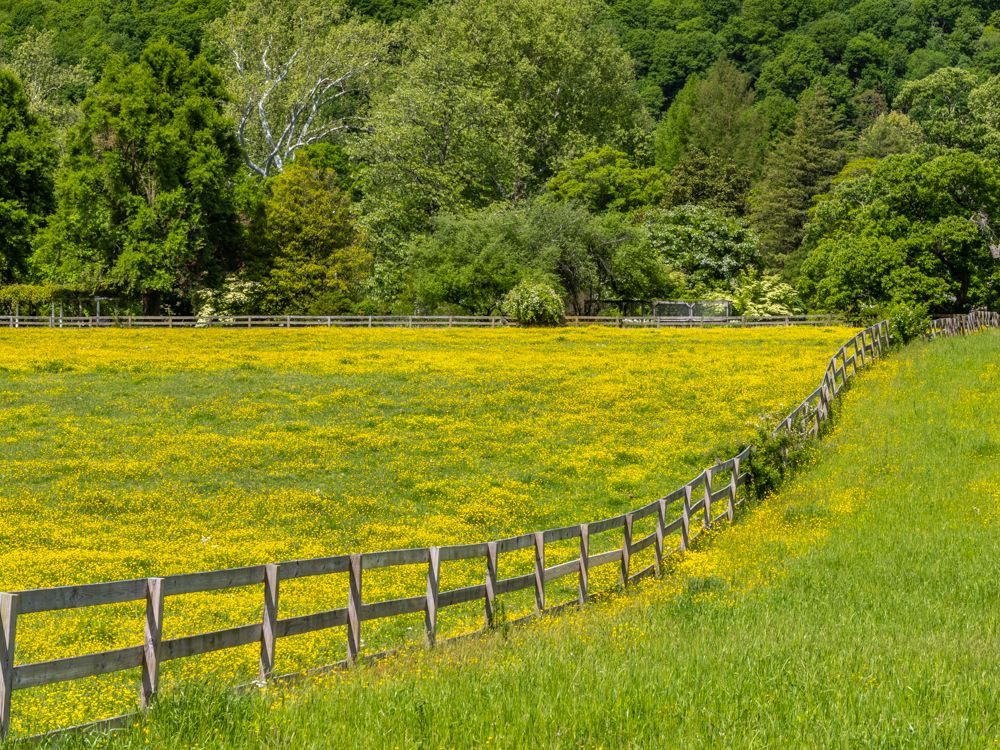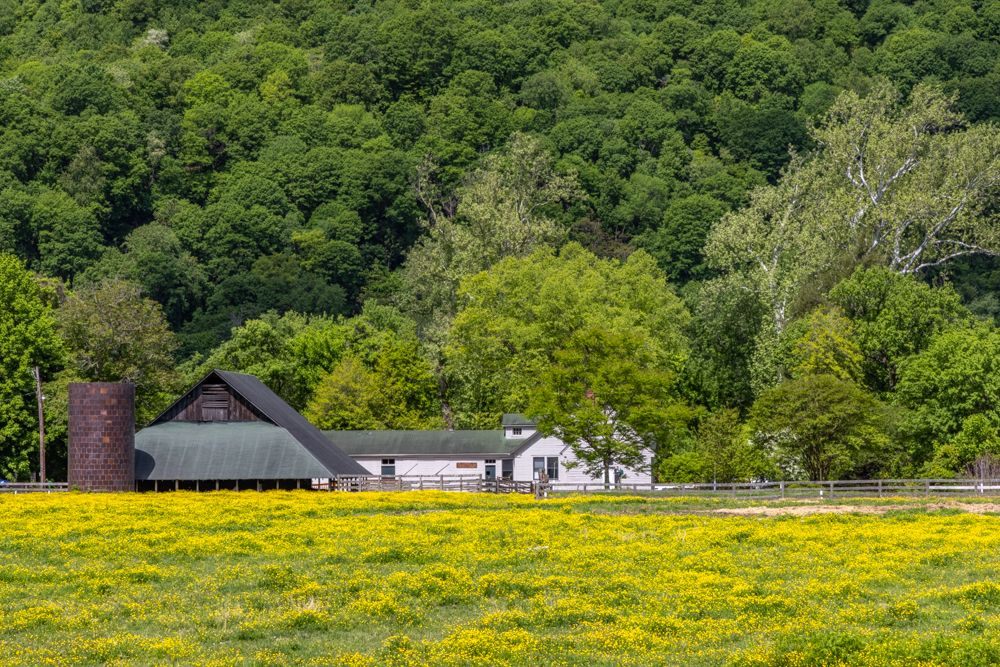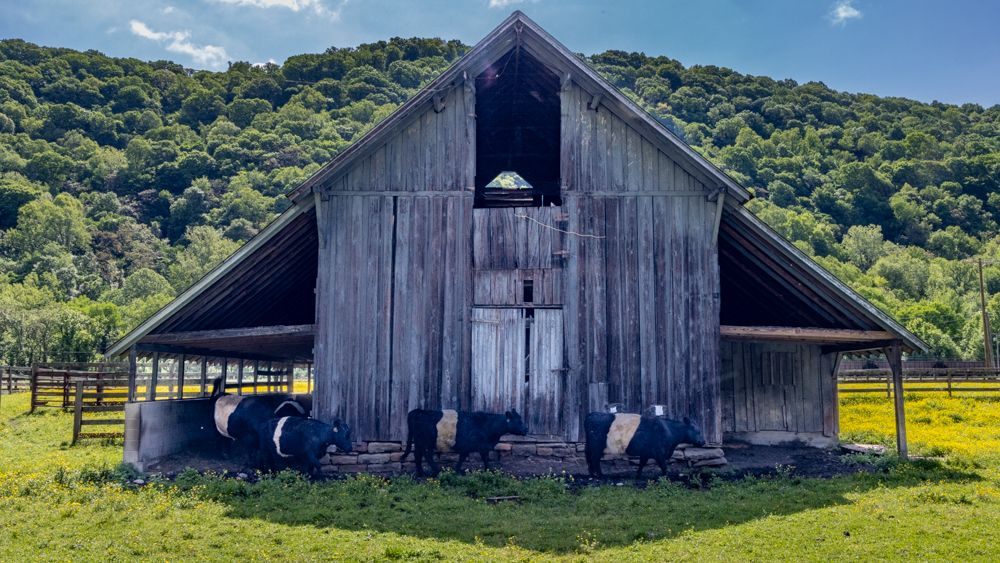 The old barn and field, now used as an event space (not sure what they do with the cows during events - these are Belted Galloways)
