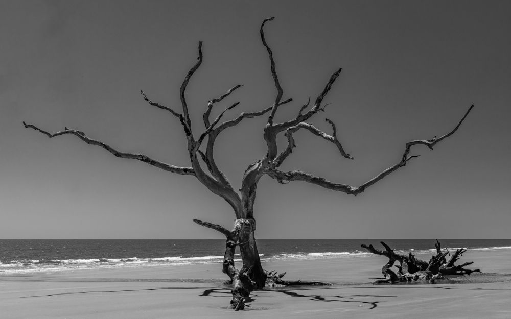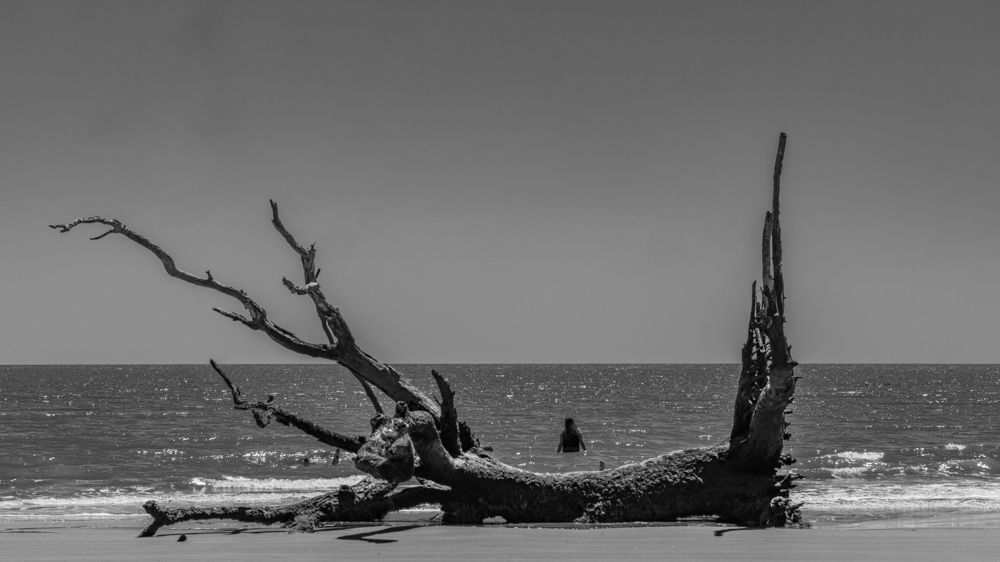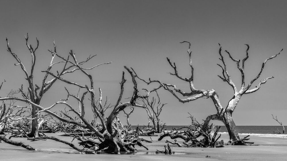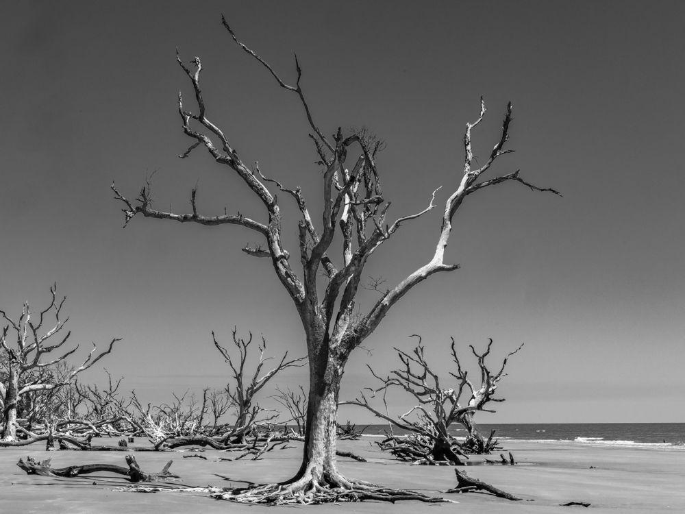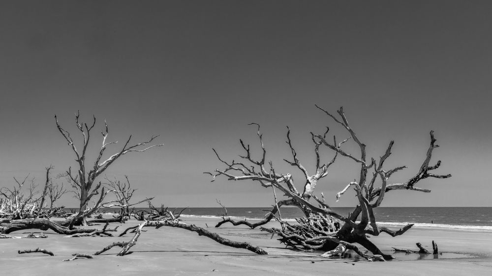 One of the main attractions of Bulls Island is the bone yard, a stretch of beach that hosts a driftwood forest. I spent a couple of hours just on this beach trying to capture the dead trees. Unfortunately, low tide was at 2:30 PM, so the light was harsh. I decided to make light-ade by converting these images to black and white. See what you think.