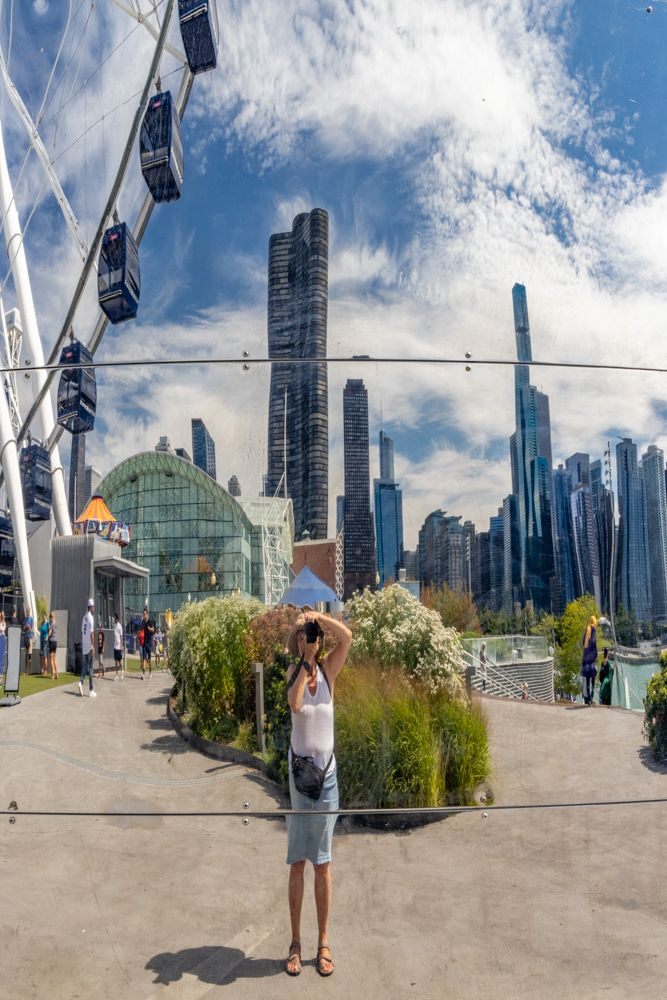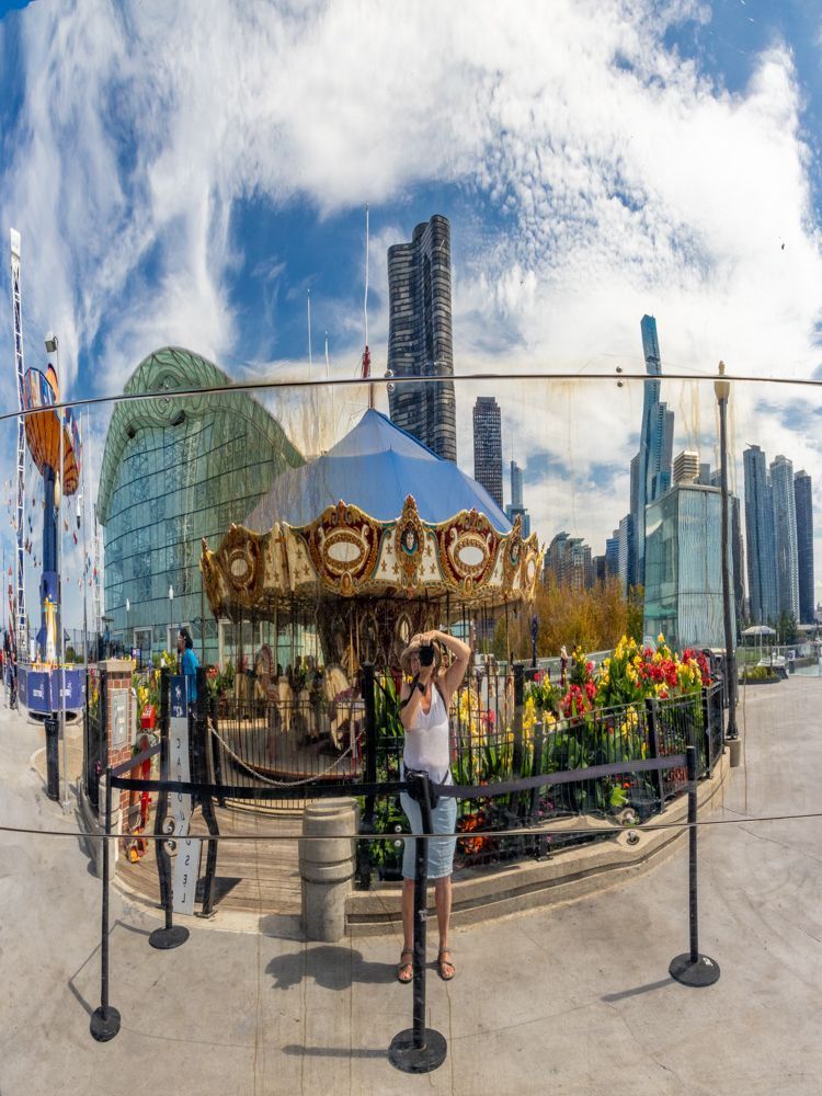Cloud Gate (better known as “the bean”) as it is an iconic Chicago photo-op. Unfortunately the area around it is undergoing renovations and it was visible, but surrounded by a construction fence, so not accessible. I did my best to try to get some photos given the limitations, but I was only partially successful. I tried climbing up on a low cement wall, but was ordered down by the security guard. Honestly, it was only about two and half feet high and surface was probably four feet wide. He insisted it was dangerous and would result in a lawsuit if I fell. Ah well.