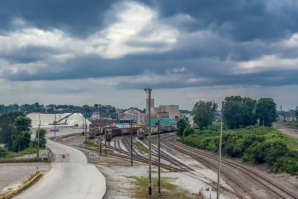 From the pedestrian bridge to Whisky Island in the other direction - taken with an iPhone through the chain link fence. Trains waiting on the tracks, a gypsum pile in the background.