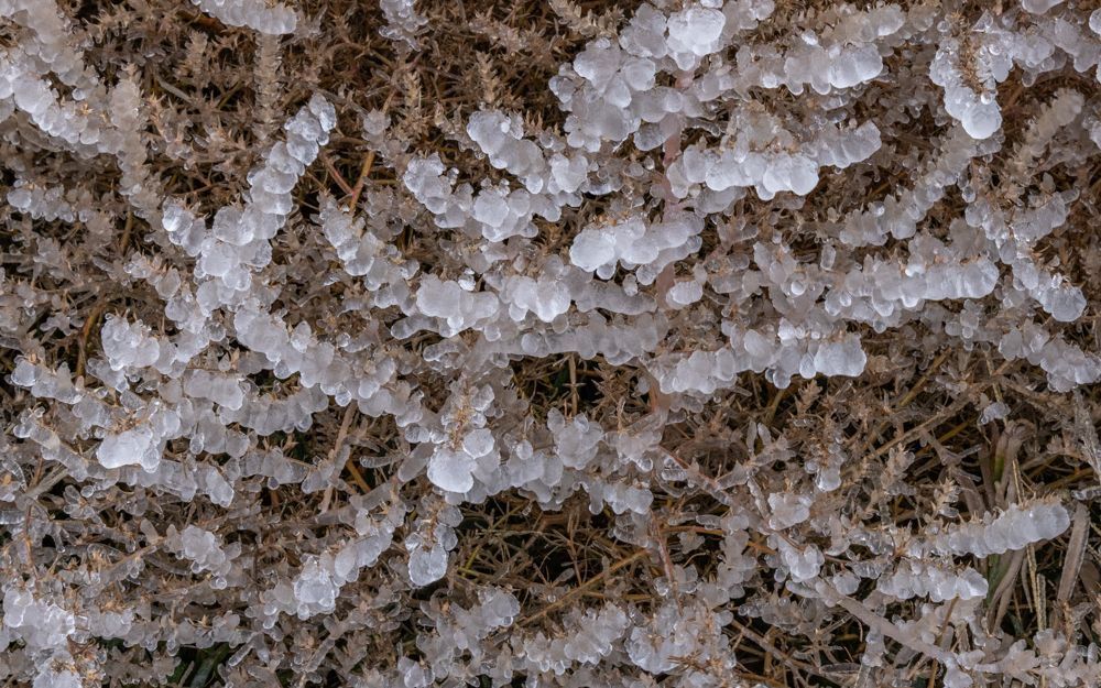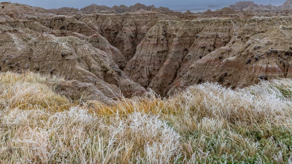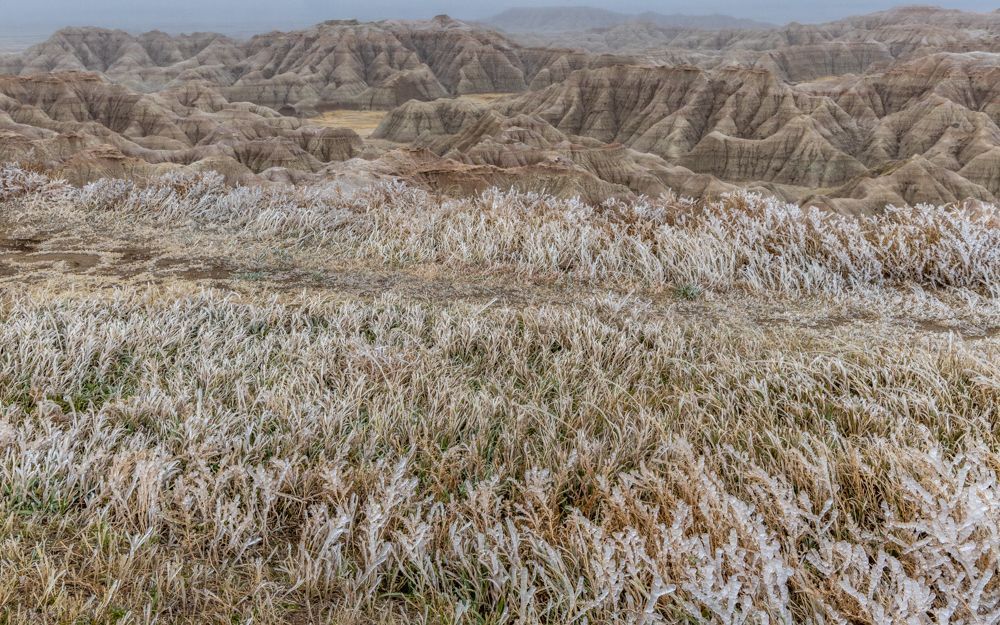 I arrived in Badlands National Park around midday. I stopped at the visitor center and Ed gave me some tips on navigating the park. This is one of those parks that is mostly a driving loop, with only a few foot trails. Ed advised that the trails would be icy and treacherous, and if I decided to do any of the hikes, I should consider adding the cleats that I purchased last year for sure footing. As I started driving around the park, it also became clear that the boardwalks had iced over. As I was just getting a preliminary feel for the park, and I knew I had two full days to explore, I decided to hold off on venturing too far out until I could get geared up. It was also quite cold - the high was 27 degrees - and there was a significant wind, making it feel more like about 15 degrees. So another layer will be in order. The next few days promise to be even colder, although sun is predicted for tomorrow.
