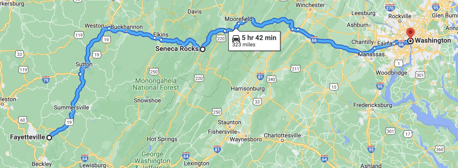 I had planned to also stop at Dolly Sods wilderness , which is down the road from Seneca Rocks. By then, though, the rain had turned from light and pleasant to more of a downpour. Neither driving mountain roads or hiking the trails would have been much fun. So I made the difficult decision to proceed directly to D.C. I was grateful to make it to my hotel in one piece - not because of the rain, but because of D.C. traffic. I was pretty sure I was not going to come out unscathed from a requisite left turn with no green arrow. Somehow I made it through the intersection. Lucy II will stay firmly put in the very expensive valet garage for the week.