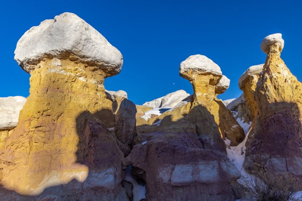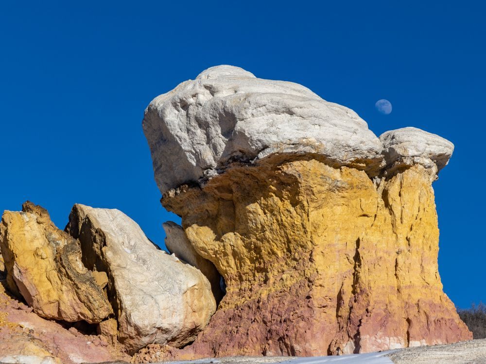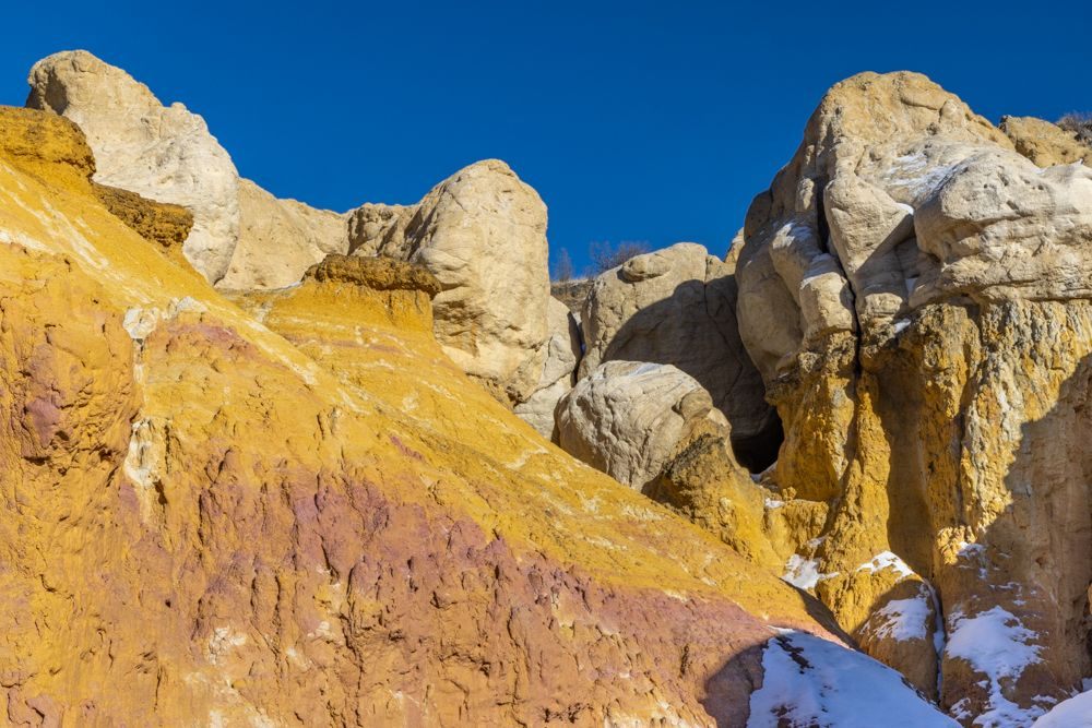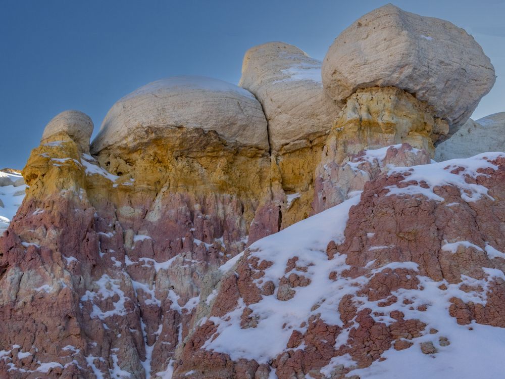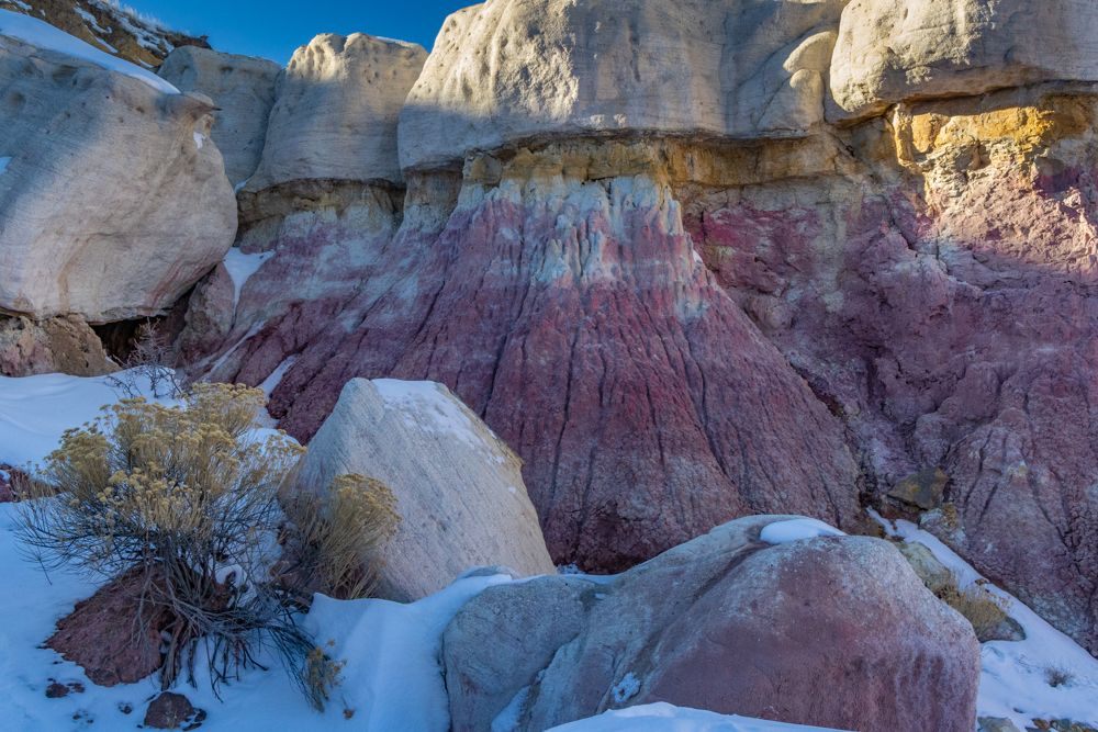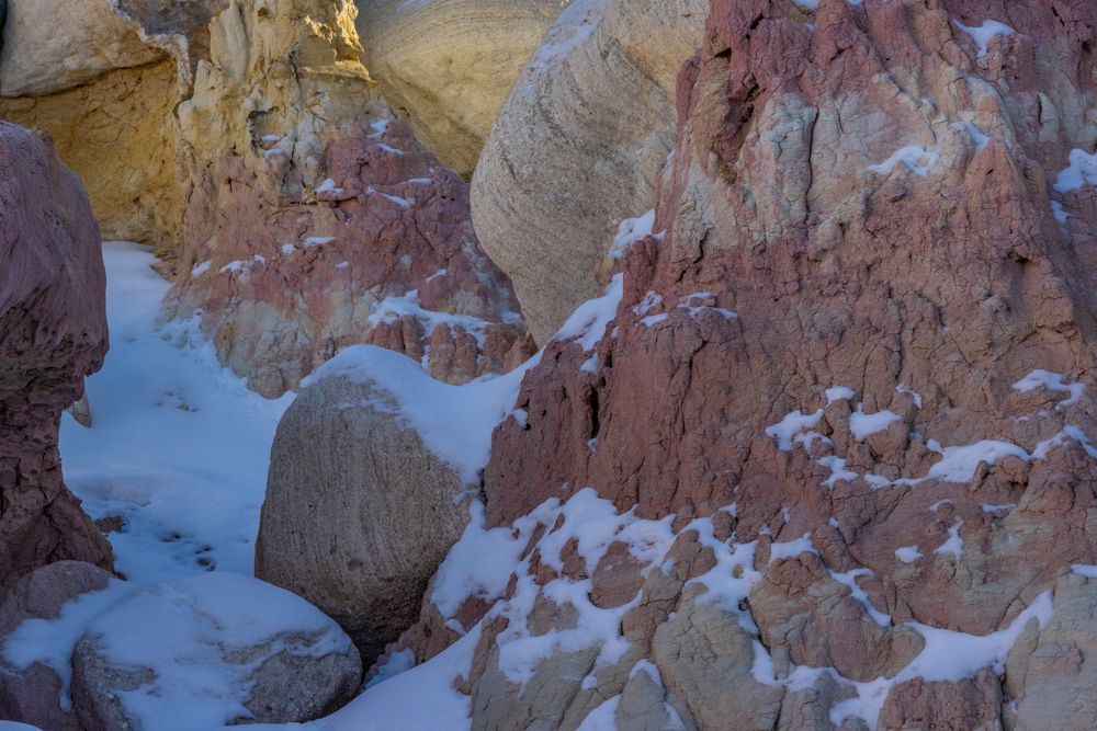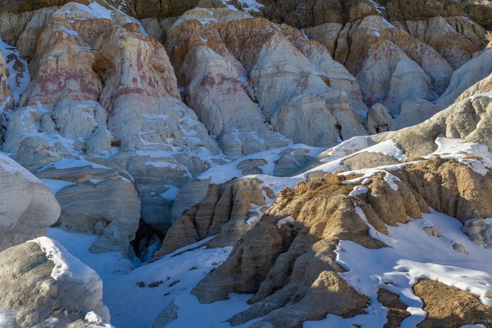 I will say first that the images on the website must reflect extreme manipulation. I can’t imagine that even on the brightest day the colors would look so garish and unrealistic. However the area does not need the over-photoshoped image. The natural formations and colors hold their own. It is a truly bizarre and other-worldly environment. The snow added an additional haunting effect. For most of the afternoon I was literally the only person in the area. Again, I was fighting the exposure as one side of the rock face was reflecting the afternoon sun and the other was shaded. I will say that I was working under practically tropical conditions as the day was clear and sunny and the temperature had risen to the mid-40s! I was able to remove my heavy down jacket and gloves!