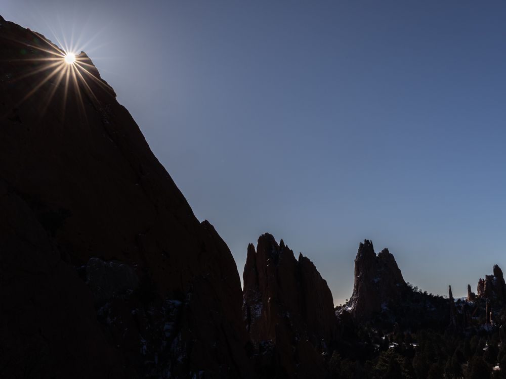 Rock formations with sun star from Parking lot 3, Garden of the Gods
