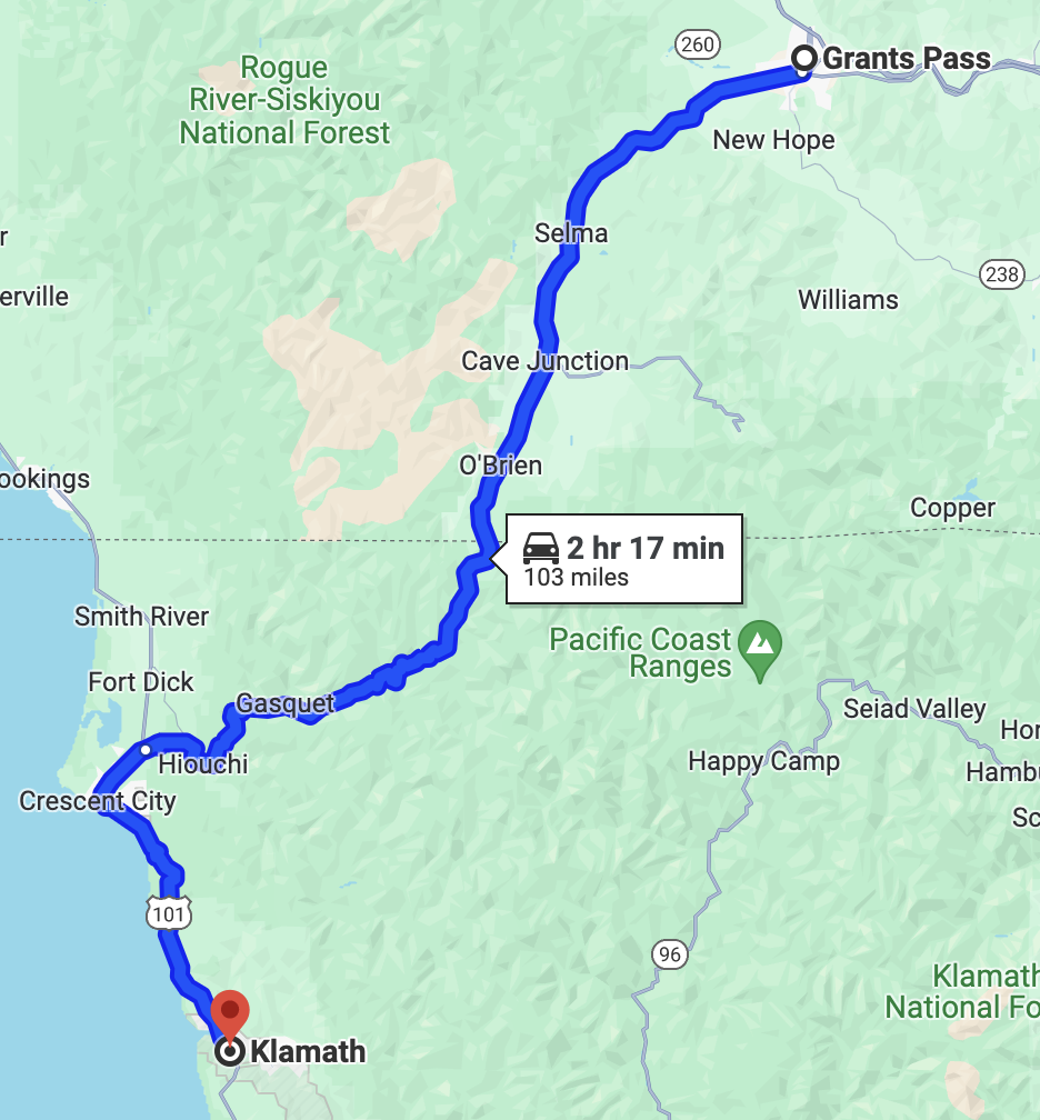 This morning I drove south to California. Grant’s Pass is only about an hour from the border. I Have to admit that I grew a bit misty-eyed when the GPS announced “welcome to California” at the same time I arrived at the sign. For once there was a nice pull-off, allowing me to get out and take my own photo rather than download an image from the internet.