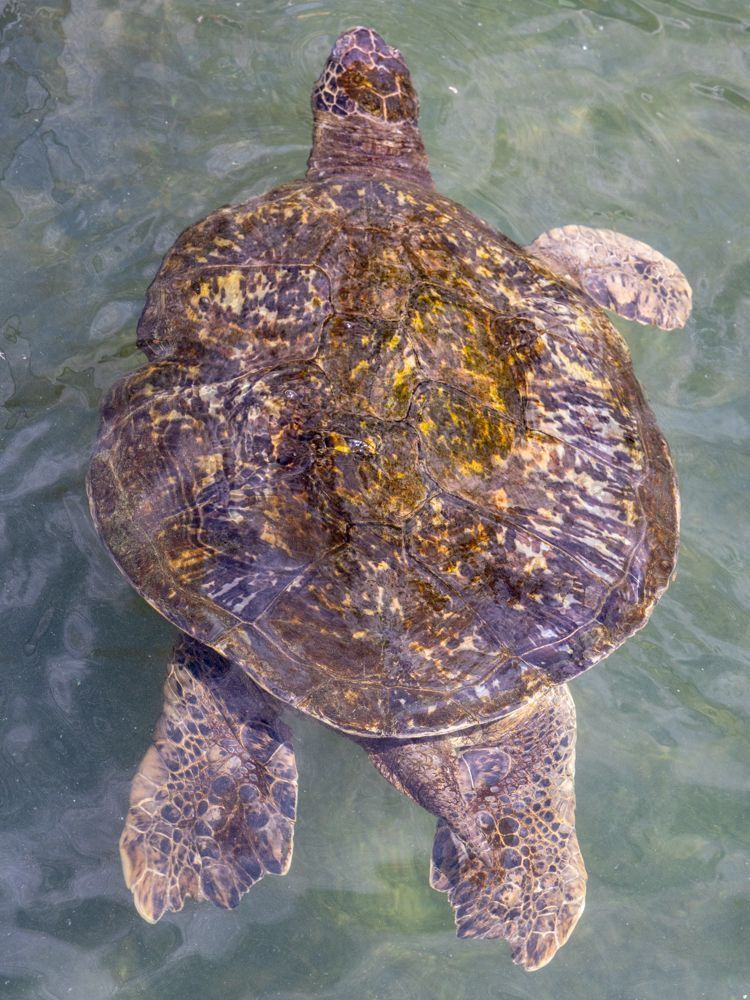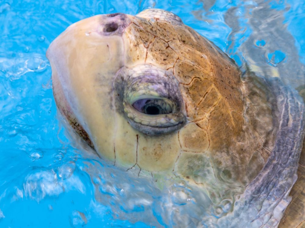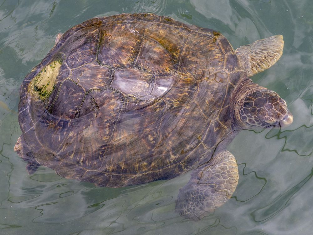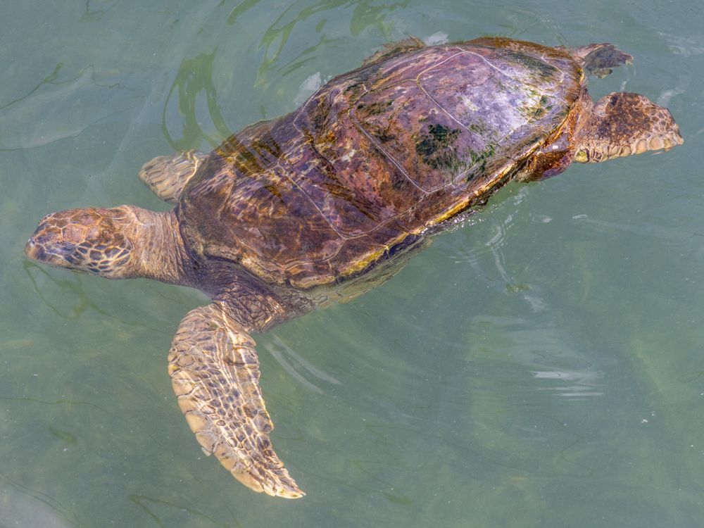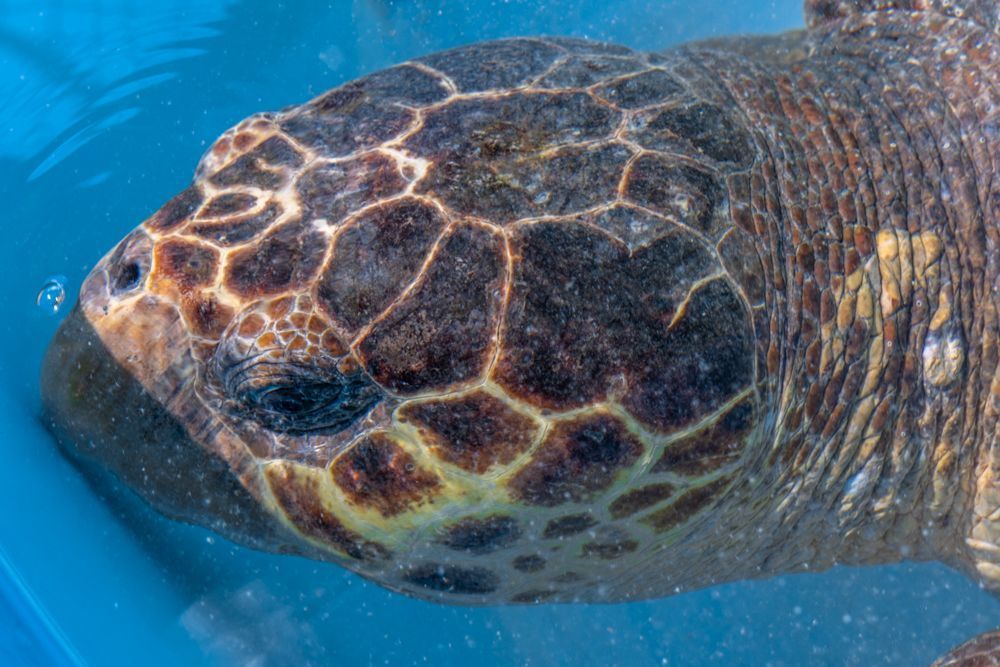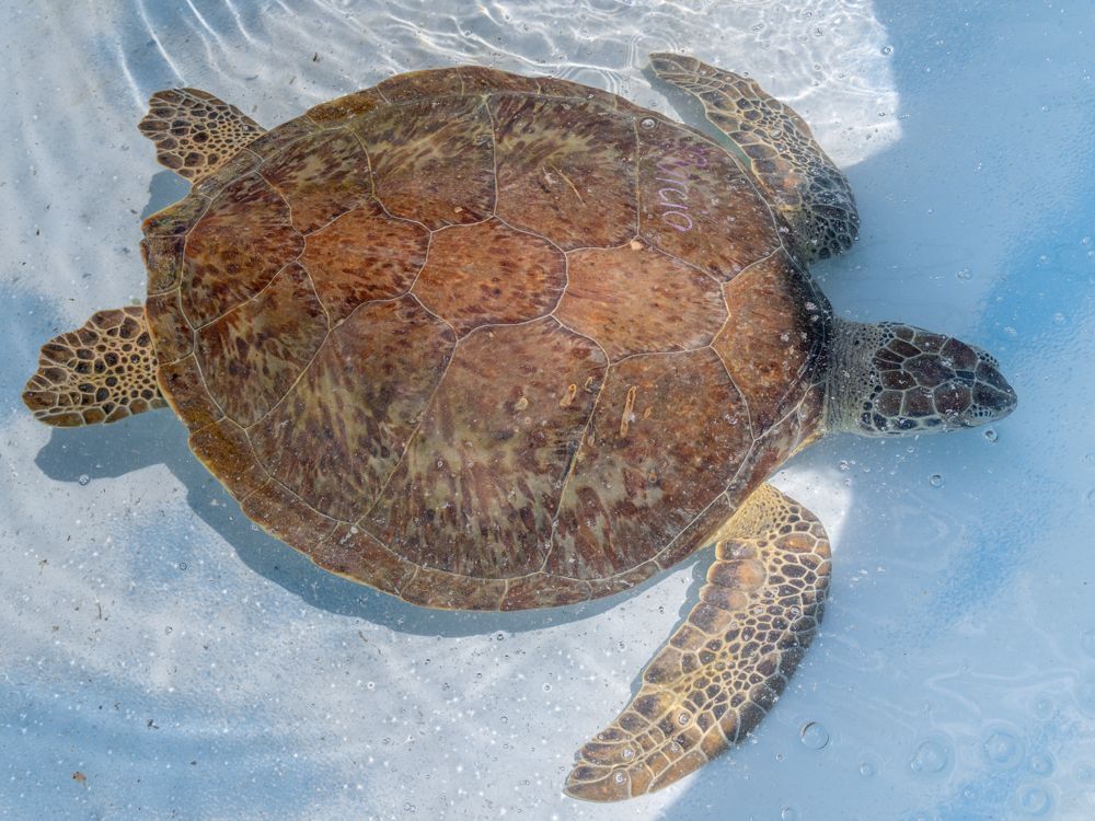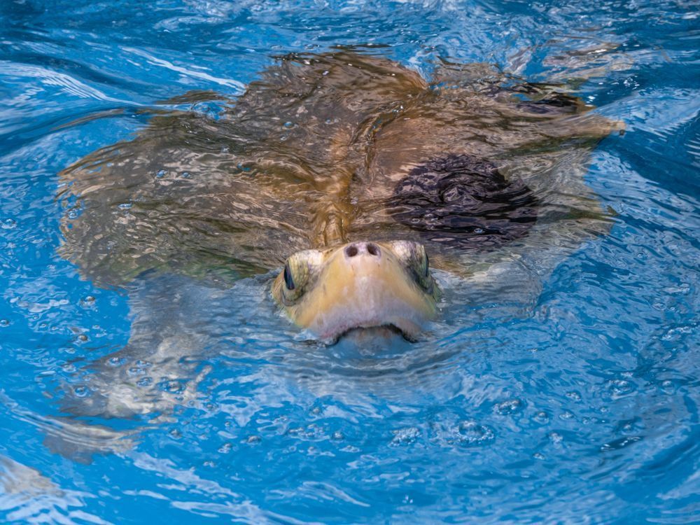 The problems can range from swallowing plastic, fishing line or hooks, to becoming entangled in fishing line, to tumors from papilloma virus, to run-ins with motor craft. A very common issue is a condition called bubble butt. This happens when the air is forced from the turtle’s lungs due to a forcible collision with a motor craft. The air then forms micro bubbles and migrates backward into the soft tissue and stays there. This causes buoyancy issues, including tilting the animal at an angle and the inability to descend to feed and escape predators. The solution is to attached weights to their shells to counteract the unnatural buoyancy. The hospital also performs surgery for many of the issues, including removing tumors and extracting swallowed item.