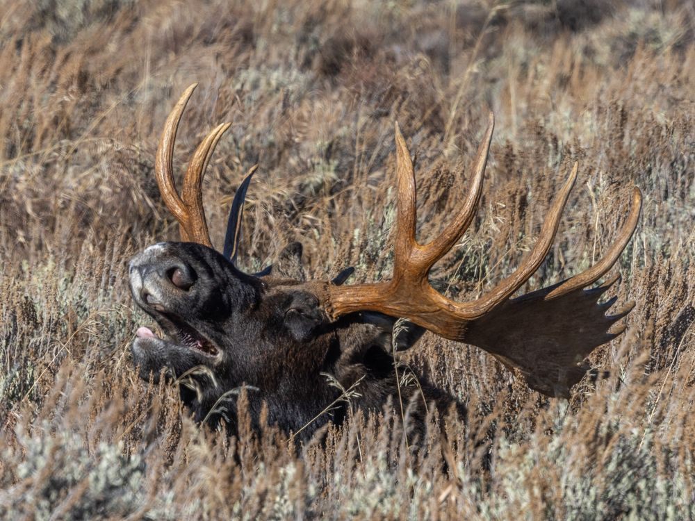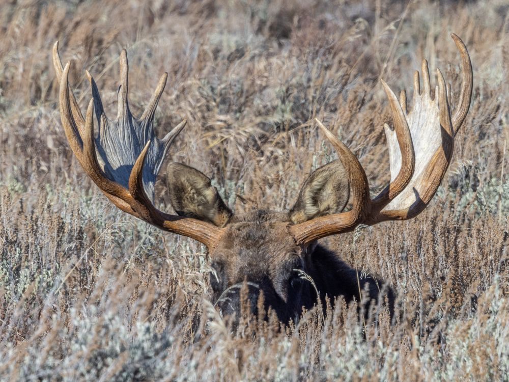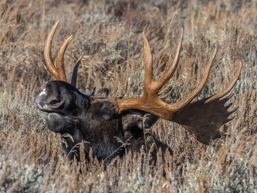 Once the light went flat, I went in search of moose. I headed back out to the antelope flats area and started driving around. While I am not particularly good at spotting wildlife, I have learned the skill of spotting people who have spotted wildlife. The cluster of vehicles and the people standing outside of them with scopes and long lenses is a dead giveaway. The first group was at a pull-out of Mormon row. They were looking at black specks in the distance that were a couple of moose laying in the sagebrush. That wasn’t going to cut it for a photo. However, I noticed some cars and people far closer to the moose and continued to see if I could find where they were parked. I finally figured out that they were up a pitted dirt road that bisected the field. Lucy II proved up to the job of navigating the short road. I parked and walked out to where I could see a group on a rise. Sure enough, three moose were bedded down about 25 yards - the closest legal distance - away. I joined PJ, Bill, Gary and Scott to wait for them to get up. These guys had experience photographing moose in this park and said that they tend to get up to feed every few hours. They had been there about a half hour already, so we took took the waiting time to chat and get to know each other a little bit.