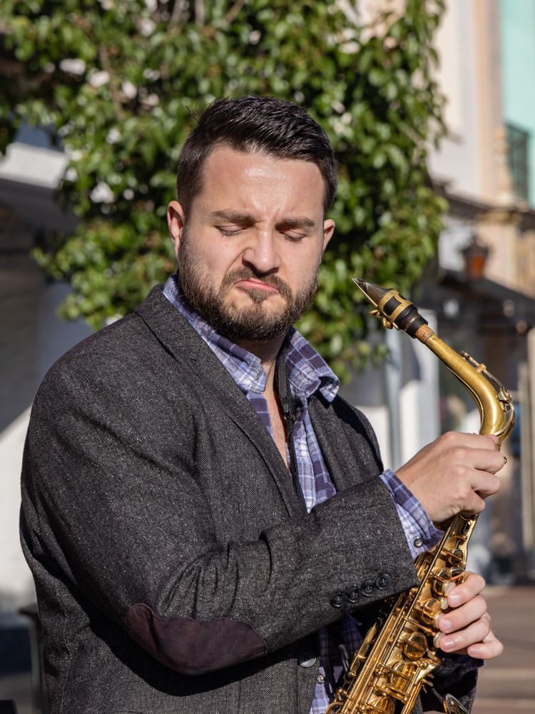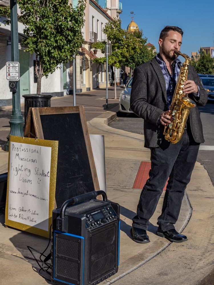 After returning to my hotel, I decided to take a short walk, both to digest the BBQ, but also to see if anything interesting was happening in the Plaza area. I found Dane playing Jazz Saxophone on a street corner. He is a professional musician, but is still trying to pay off his student loans. I made a contribution and took some photos. He is currently transitioning his website, but you can fine him on