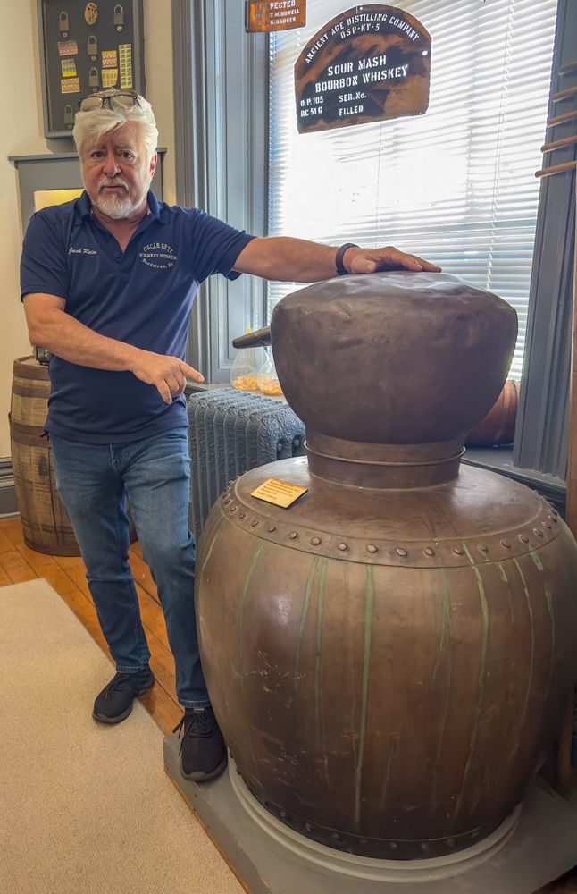 Oscar Getz Museum of Bourbon history one more try. Before driving out, I called to make sure they were open. The woman who answered insisted that they had been open on Sunday, but I think that was an expectation rather than a confirmation. Soon after arrival, I was greeted by Roger. Roger is originally from Chicago, but lived in California for some time before moving to Bardstown to become involved Bourbon culture and the museum. The museum contains the largest collection of whisky and Bourbon artifacts in the world, and Roger had many stories to accompany the collection. He showed me the still that had been recovered from a descendent of George Washington (whiskey sales had been used to finance the Revolutionary War effort) and a particular bottle that had been barreled prior to Prohibition and bottled after, as evidenced by the dates on the label. He also told me about the history of Oscar Getz and of the building before it was acquired from the museum.