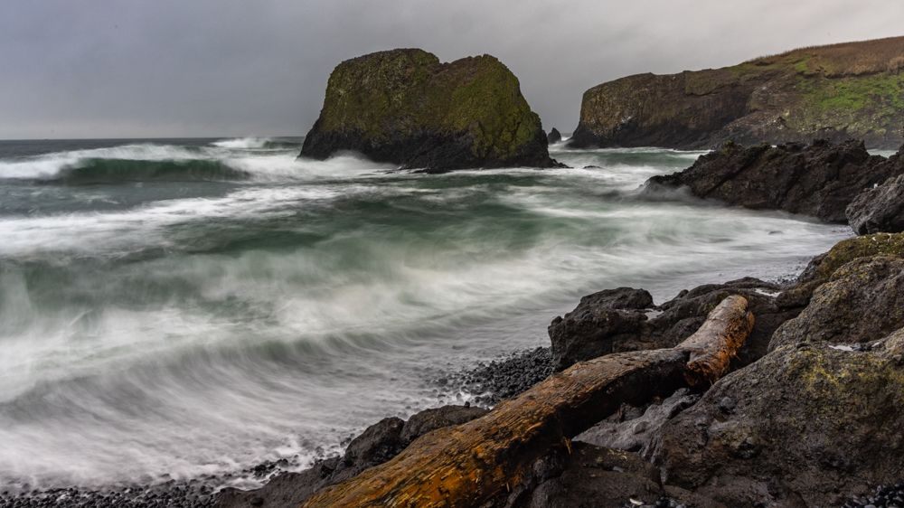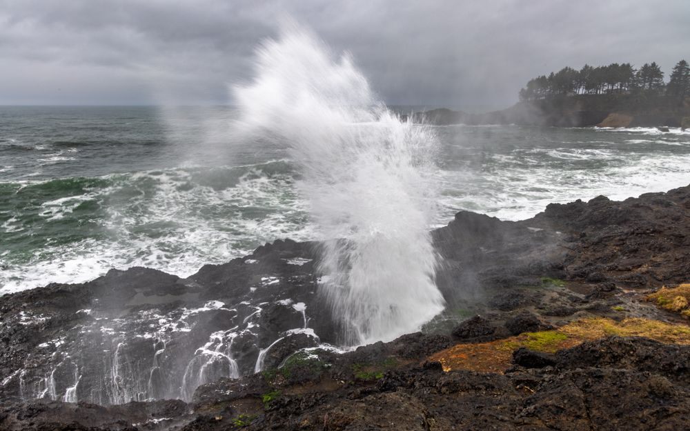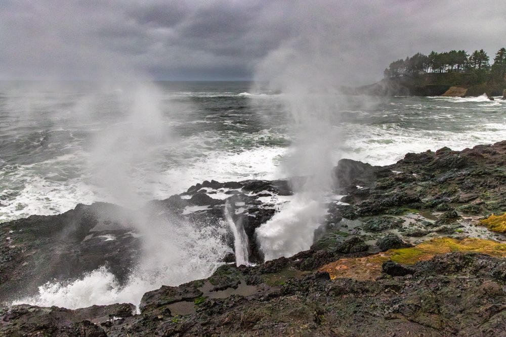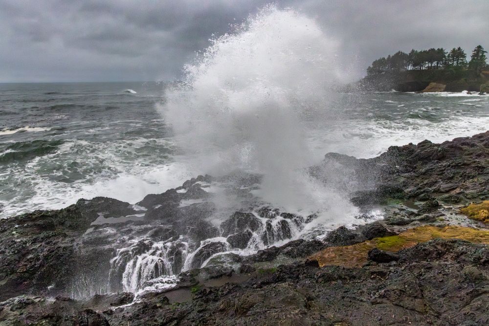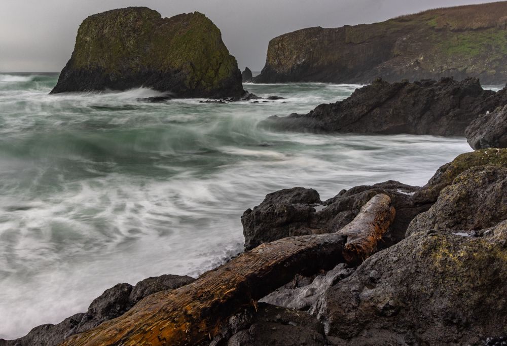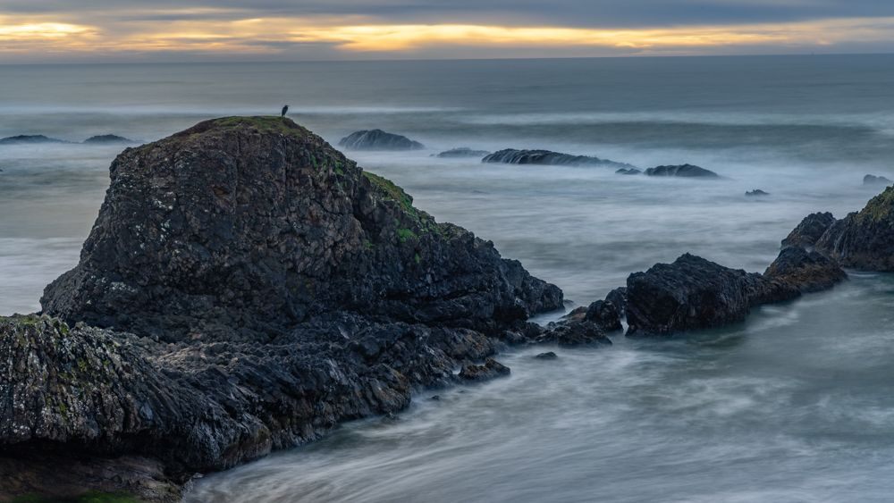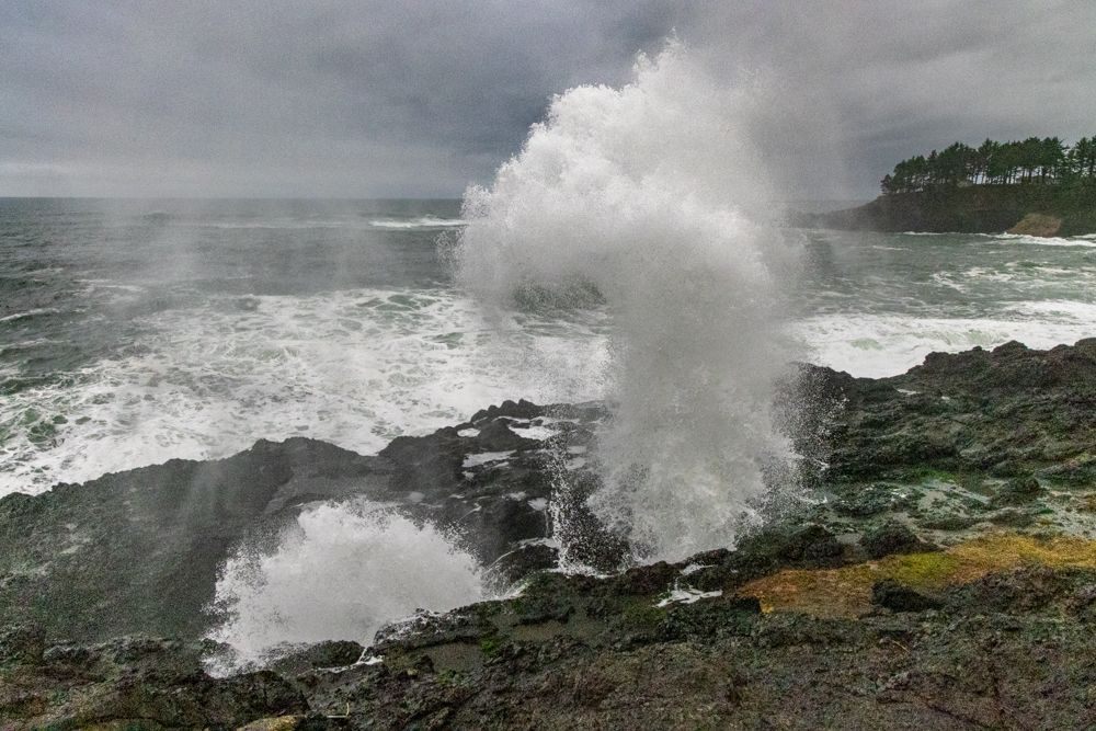 We stopped at two places at or near the height of the waves, Depoe Bay and Yaquina Bay. We then took a lunch break at Szabzy’s restaurant, across the highway from Yaquina Bay. The place is listed exactly nowhere and it does not even appear on Google Maps. Perhaps it appears out of the mists only at midday when you drive up to it. Fortified, we drove further down the coast to an unnamed bluff just past Agate Beach, where we stayed for sunset.