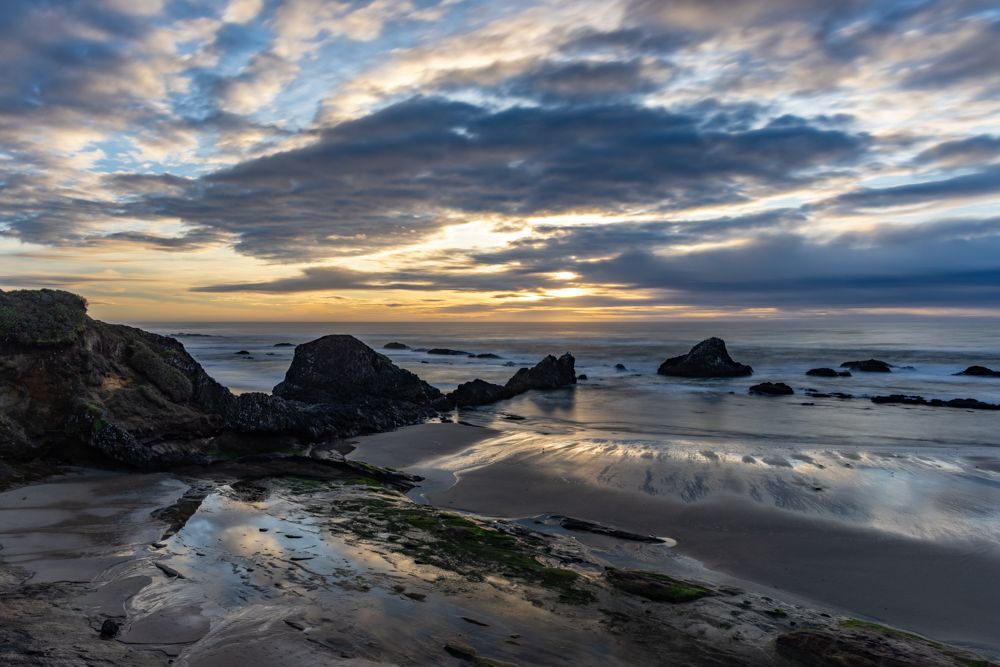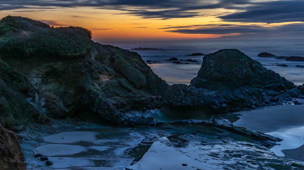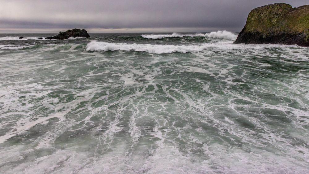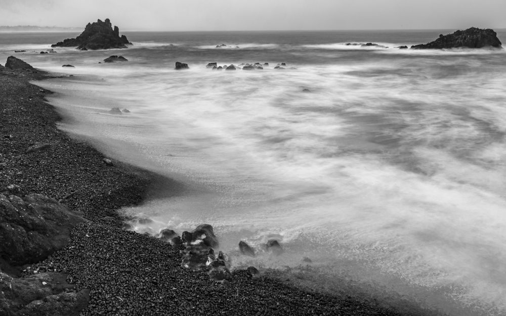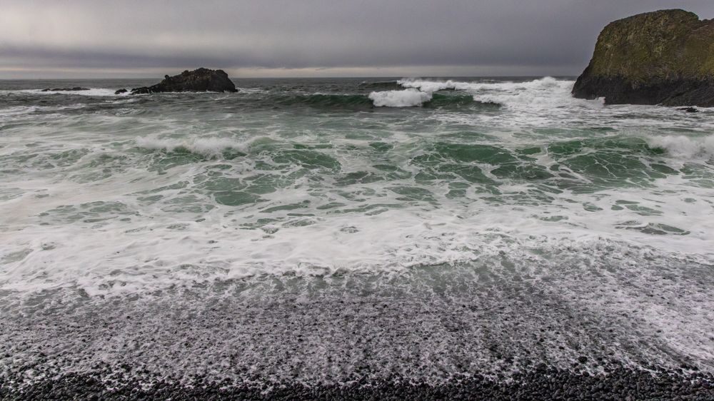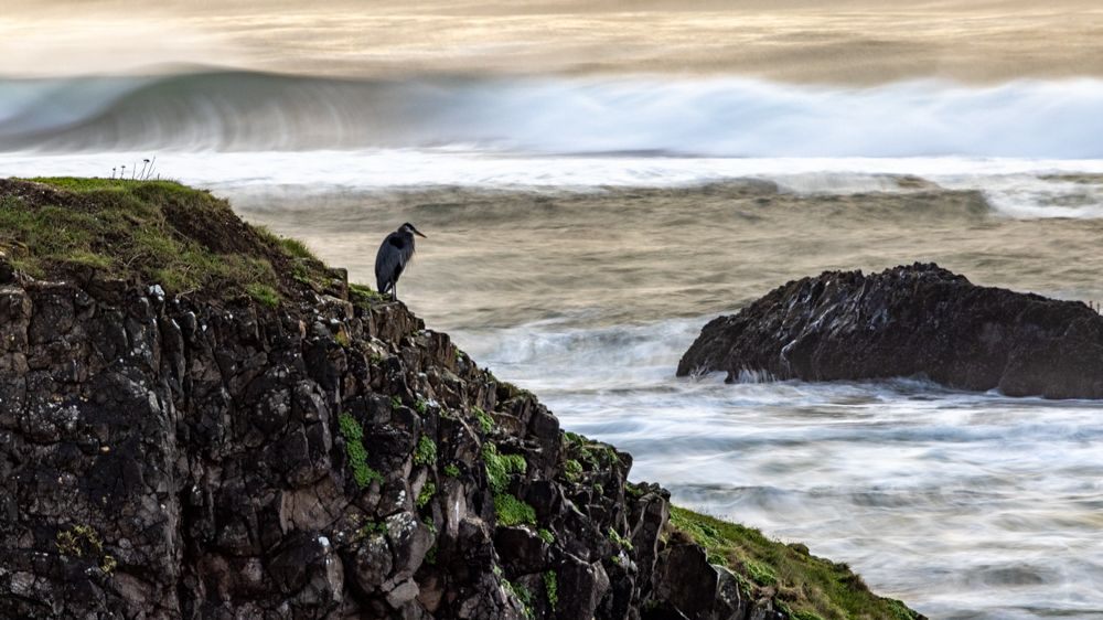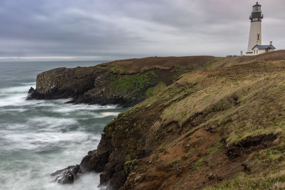 We stopped at two places at or near the height of the waves, Depoe Bay and Yaquina Bay. We then took a lunch break at Szabzy’s restaurant, across the highway from Yaquina Bay. The place is listed exactly nowhere and it does not even appear on Google Maps. Perhaps it appears out of the mists only at midday when you drive up to it. Fortified, we drove further down the coast to an unnamed bluff just past Agate Beach, where we stayed for sunset.