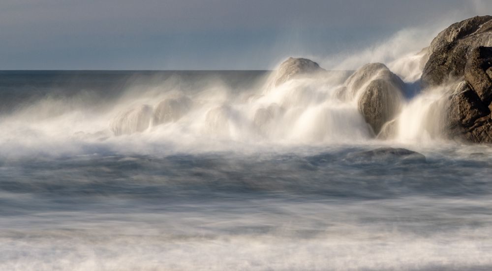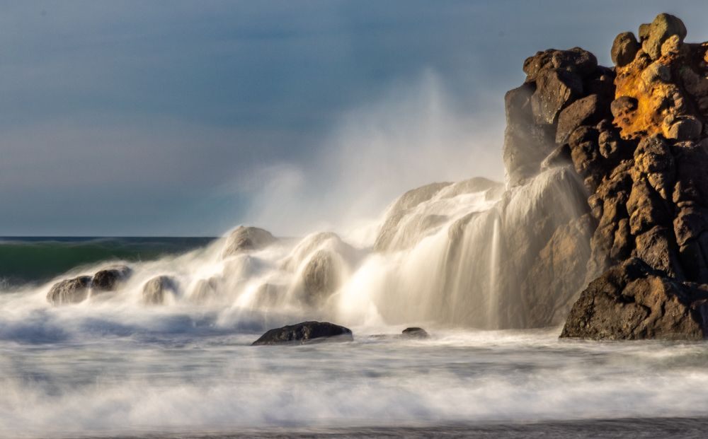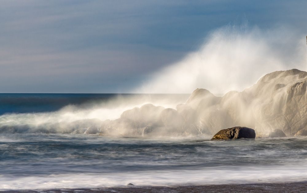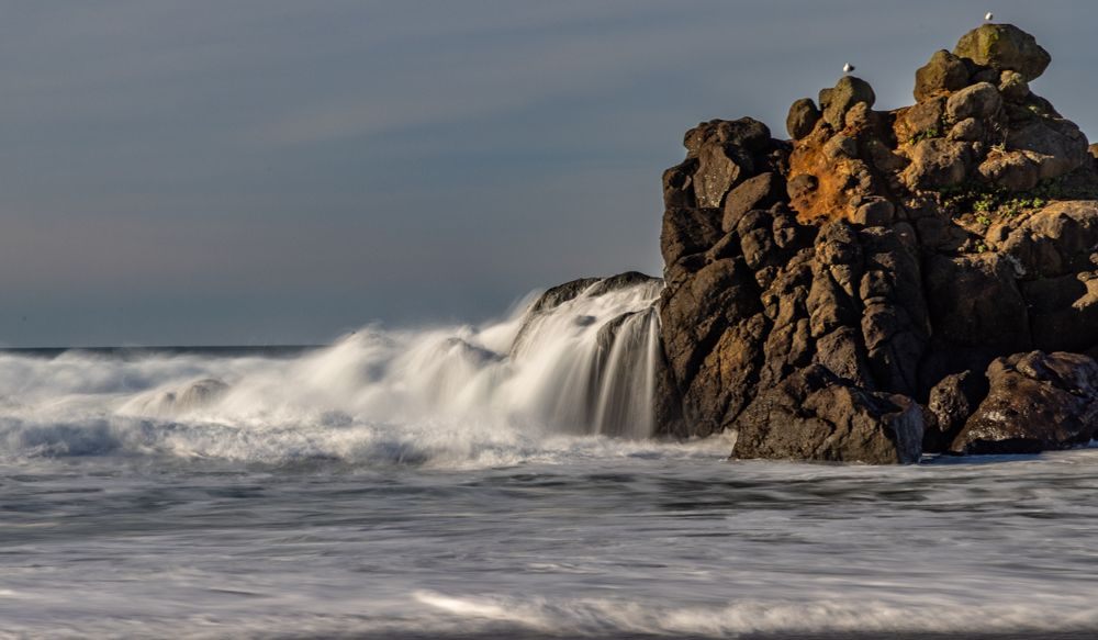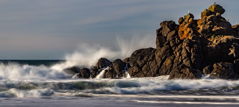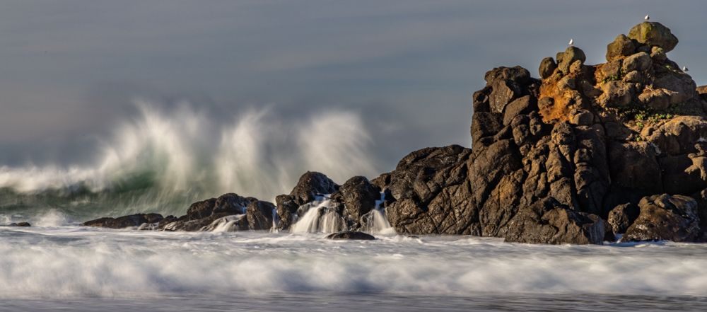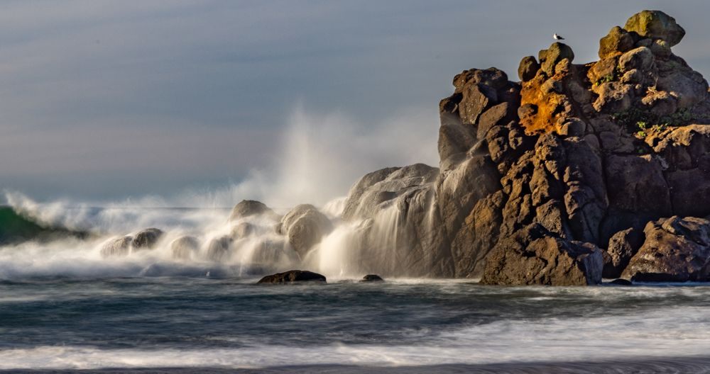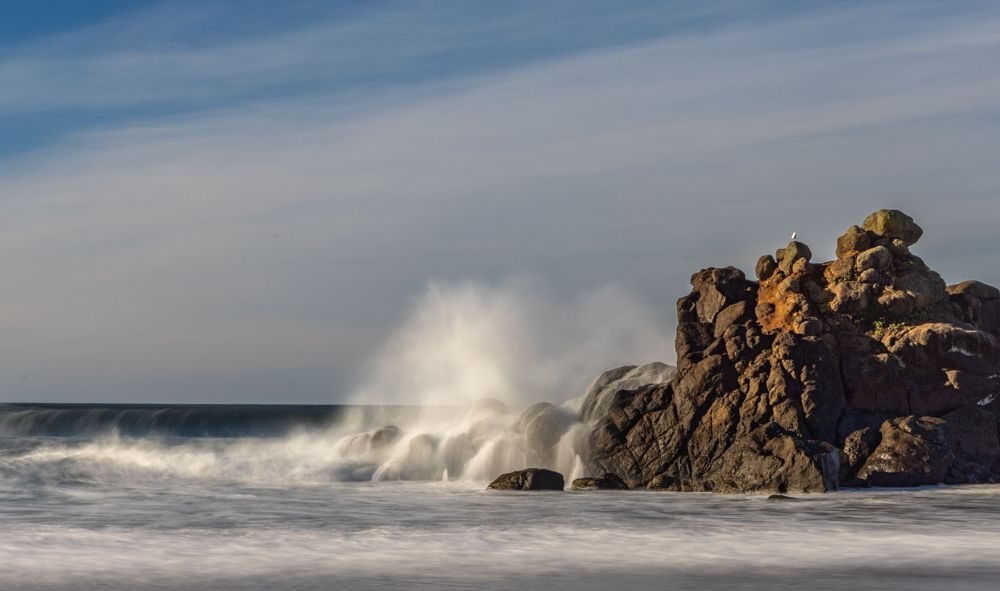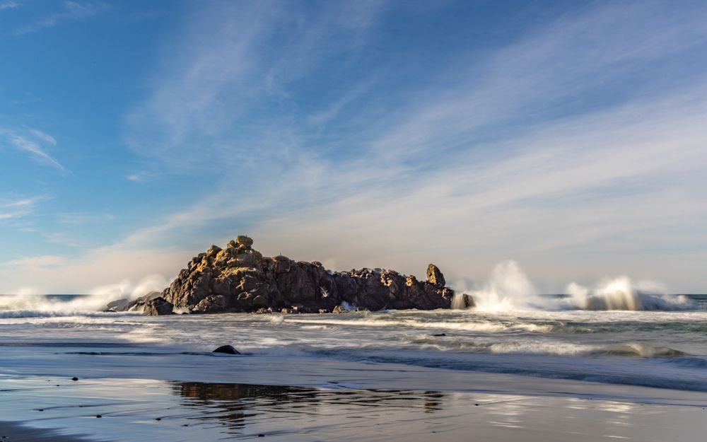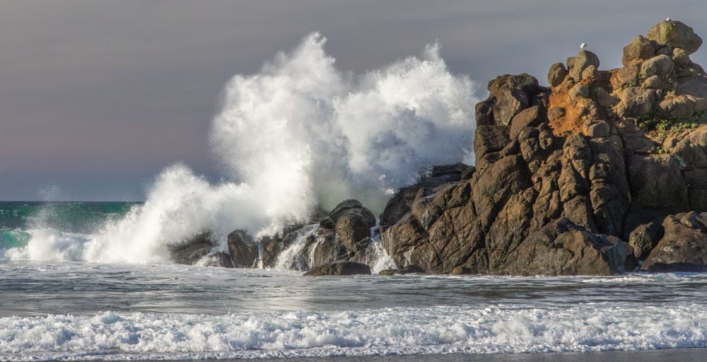 We purposefully got a late start this morning as we knew that high tide was not expected until about midday. We wanted to find a different spot than yesterday, so we drove a bit north. We ended up at Fogarty beach which, because it required parking across the street and walking under an overpass, was remarkably deserted. Although a few more families showed up later in the afternoon, it never got crowded. We were so entranced with the waves that we had to tear ourselves away at 2:30 PM to go get some lunch.