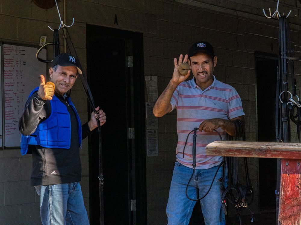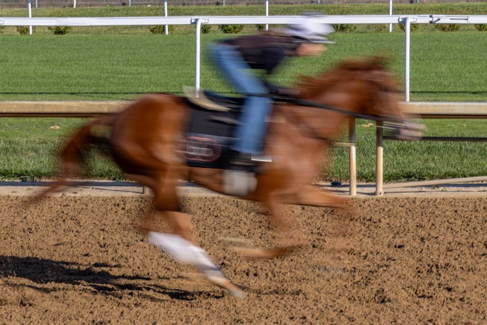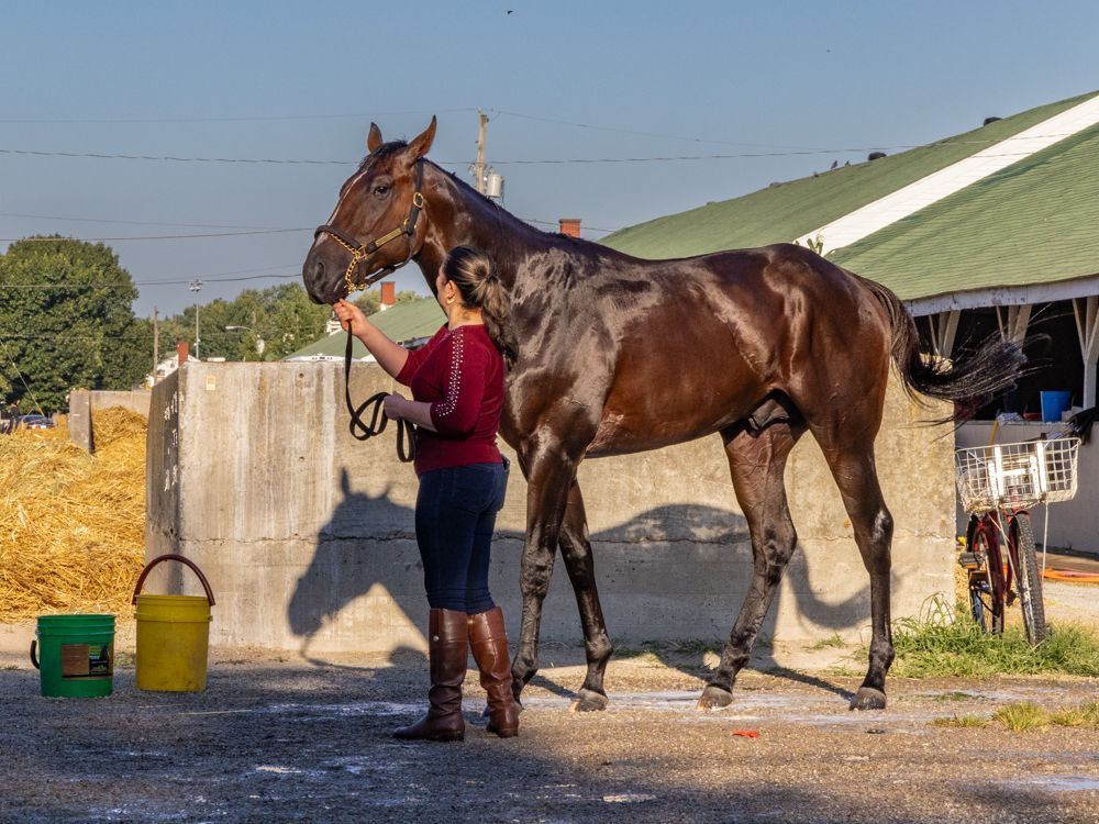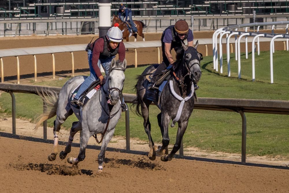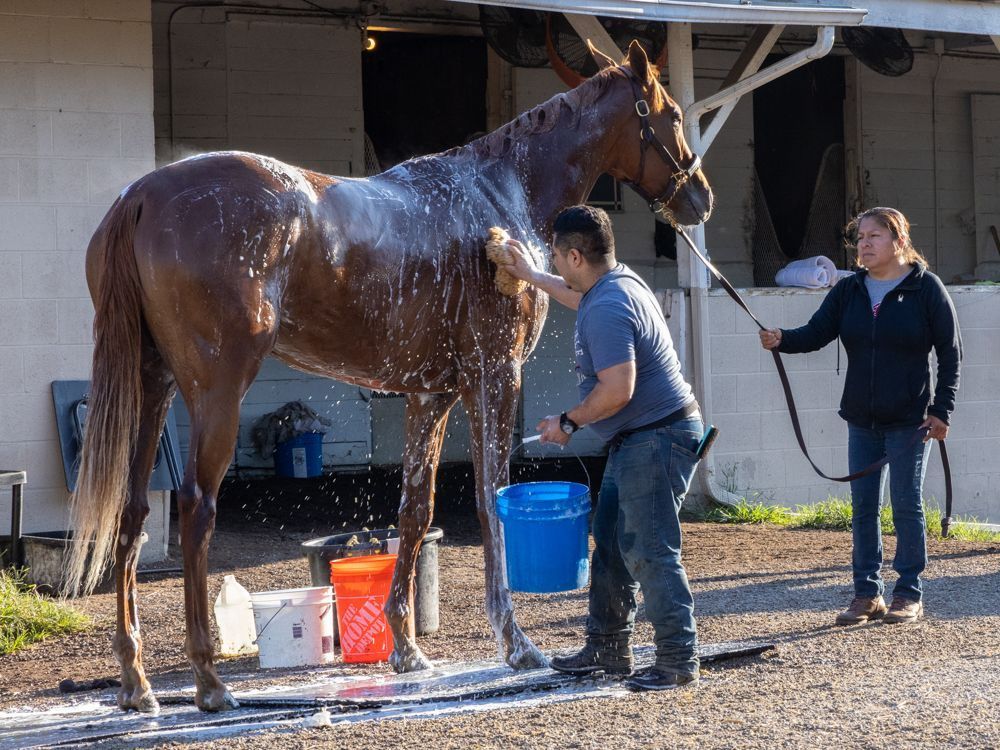 Our group comprised only five people. I think anyway the limit was six for this extended tour, which included the backstretch workout, the stables and some of the interior spaces. Although the light was a bit harsh (the curse of a pleasant day), I was finally able to get some shots of galloping horses. As well, we were able to view some of the post-workout cool-down, including washing and grooming of the horses. The interior portion of the tour was less interesting to me. We were shown the rooms where the celebrities and millionaires sit, as well as the table where Queen Elizabeth sat when she attended the Kentucky Derby.