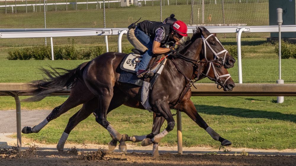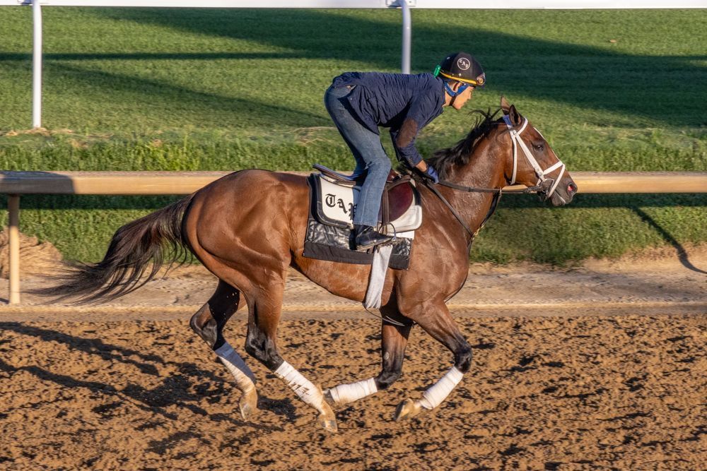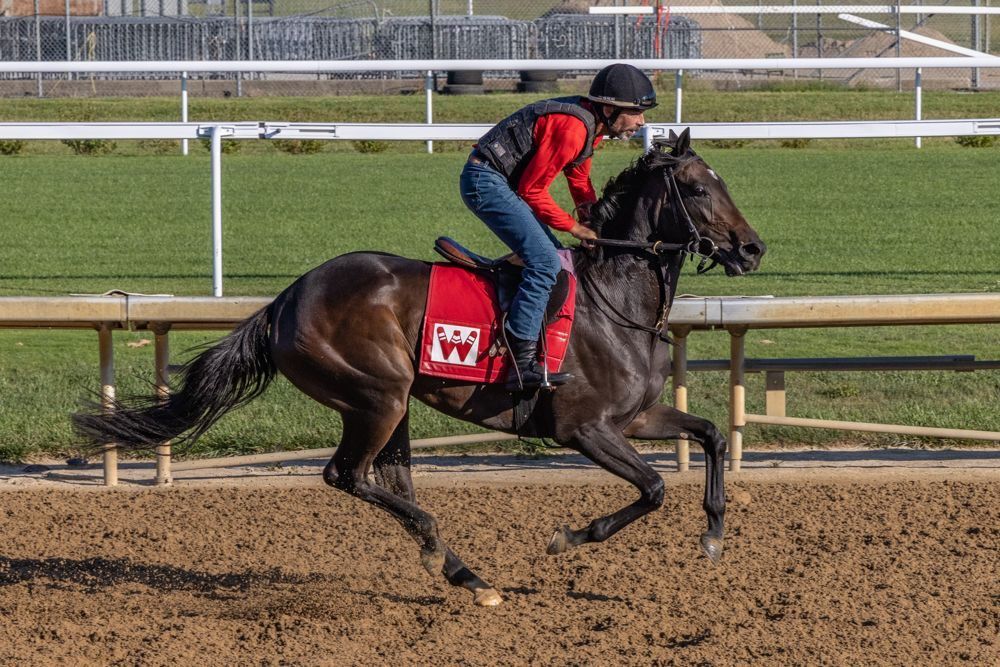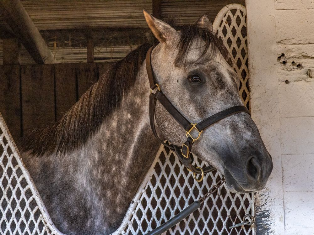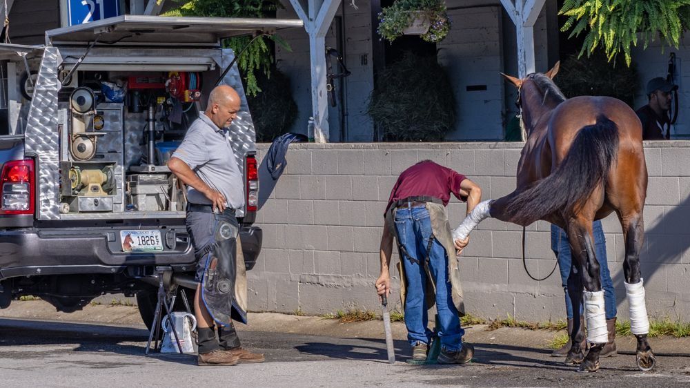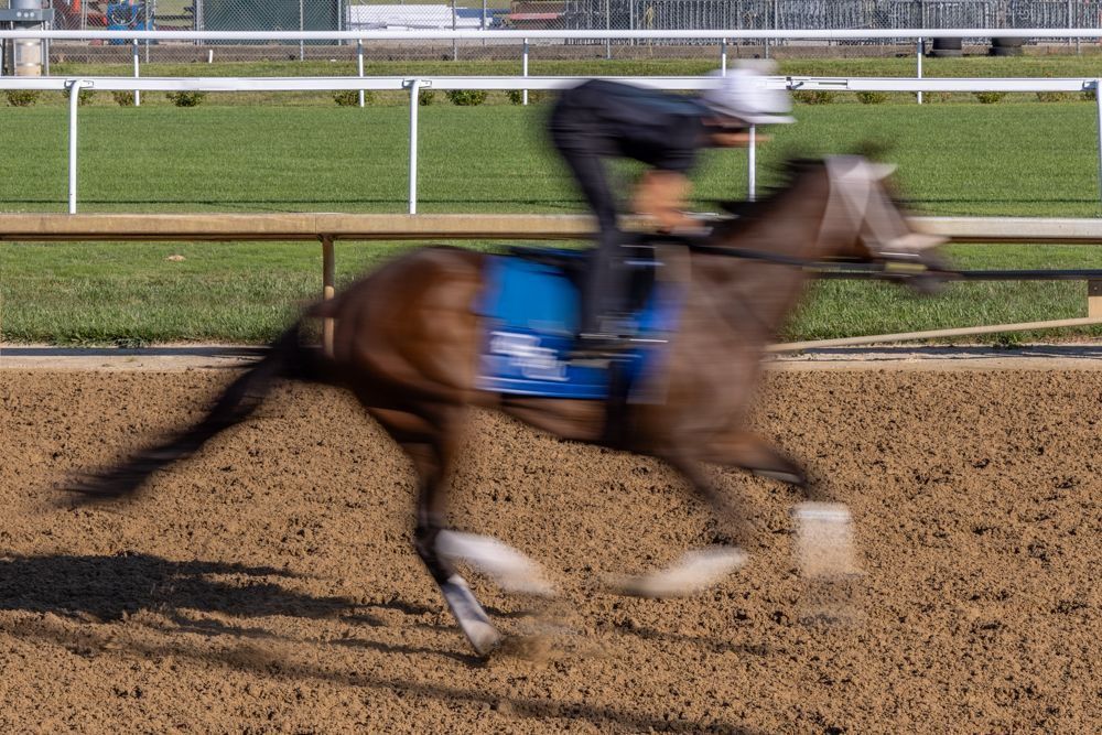 Our group comprised only five people. I think anyway the limit was six for this extended tour, which included the backstretch workout, the stables and some of the interior spaces. Although the light was a bit harsh (the curse of a pleasant day), I was finally able to get some shots of galloping horses. As well, we were able to view some of the post-workout cool-down, including washing and grooming of the horses. The interior portion of the tour was less interesting to me. We were shown the rooms where the celebrities and millionaires sit, as well as the table where Queen Elizabeth sat when she attended the Kentucky Derby.