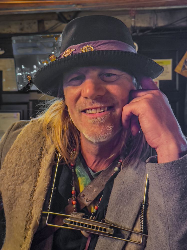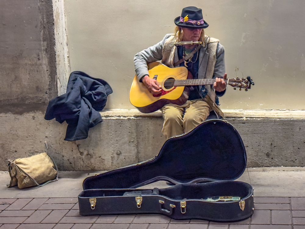 I walked around the corner to Alley Taps bar to get a drink and hear some music. Although Kyle, the bartender was friendly, the other patrons were pretty insular. The group that was supposed to play at 6 PM didn’t show so I went looking for another place to hear some music. In the alley outside of the bar I ran into Cassidy Rose. He was carrying a guitar so I asked him if he was headed in to play at Alley Taps. Apparently not. He invited me to his “office” (the curb down the alley) to hear a song. He explained that he had fallen on hard times (isn’t that the essence of country music?) and I offered to buy him a beer at the bar. That was at least enough to fuel him for a bit as he returned to his “office” to play for the rest of the evening.