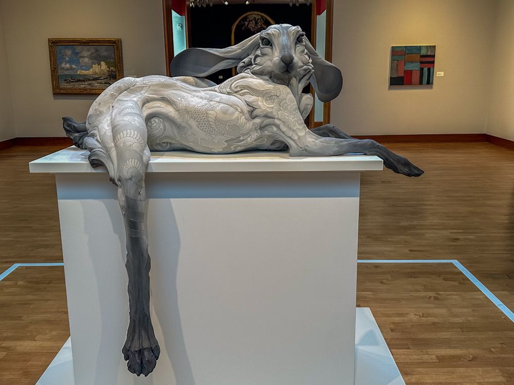 I then headed to my hotel to take a short rest before heading back out to visit the Chazen Art Museum on the University of Wisconsin campus. School is definitely in session, as evidenced by the hordes of students around campus and in town. This small museum has an eclectic collection and some very interesting pieces. I learned that the organization is unusually chaotic as one half of the building is being renovated, so pieces have been hung wherever they fit, just to keep them on display. A Miro is next to a Warhol is next to a Lichtenstein (OK, the makes sense) is next to some random piece from a lesser known artist. They have an extensive collection of Asian art, as well as a nice collection of African art. They also have a larger percentage than is typical of statuary, including one of the most unusual pieces I have ever seen, a larger than life-sized tattooed rabbit by Beth Cavener and her husband, Alesandro Gallo.
