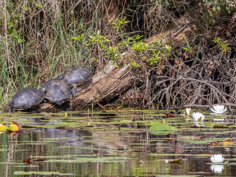 I then headed a couple of miles across the bay to Gator Alley Boardwalk in search of gators. Not a one. A lone turtle climbed out on a log to sun itself.