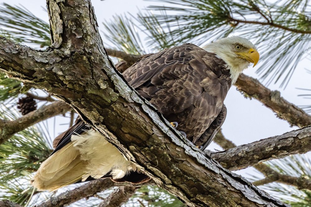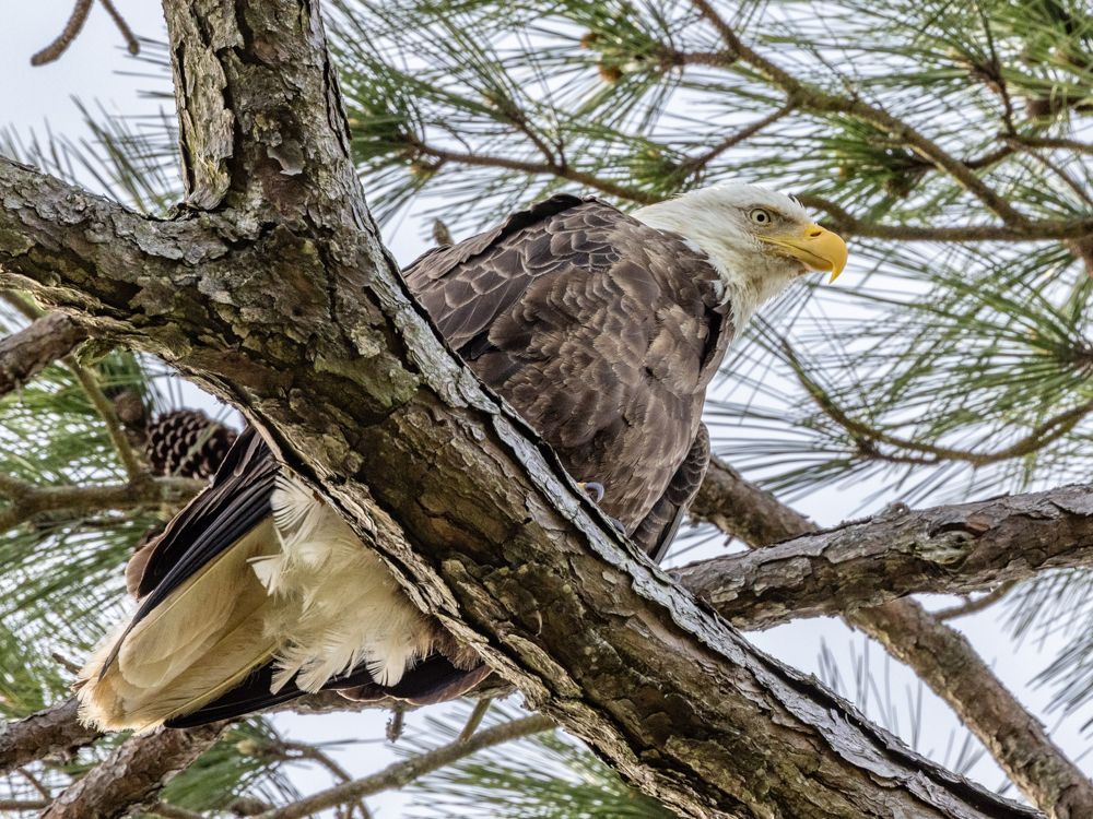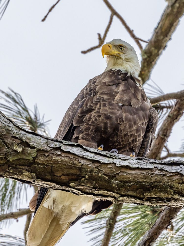 While at the sanctuary, I heard there was a bald eagle nest off one of the streets in town. I did not see the nest (I later heard it was a few streets away from what I had been told), but I was lucky to find a bald eagle, probably mom. I’m not great at spotting stationary birds, but I saw it fly in to sit in a tall pine, where I had a good 10 minutes to shoot it.