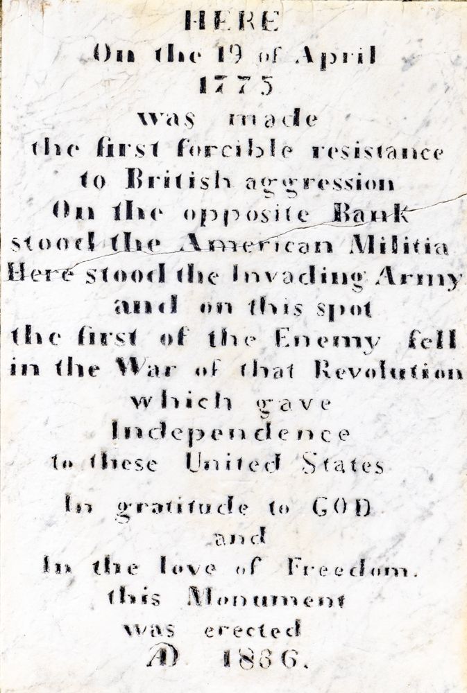 The tide of battle changed at North Bridge in Concord. Until then, the colonists had been on the defensive, participating in small skirmishes along the way. The Colonial Minute Men and Militia had assembled on Concord’s North Bridge. Major John Buttrick held his troops’ fire until the first shot was fired by the British. Then, at 9:30 AM, he ordered his troops to fire. For the first time colonists were commanded to open fire on the King's troops. Commemorated by Ralph Waldo Emerson in his poem “