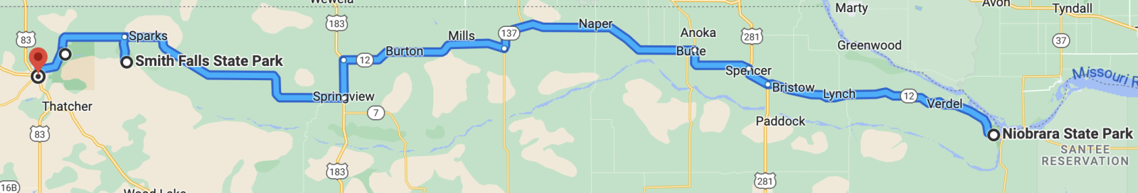 I stopped at Smith Falls State Park and braved the winds to walk out to the falls. By the time I got there it was midday and I was fighting the sun. I did the best I could (see photo below), but if I have time tomorrow I might give it another try earlier or later in the day. It is a pretty short walk on paved paths and a couple of suspension bridges. Similarly, I stopped at the Fort Niobrara Scenic Overlook, but captured only a pedestrian shot. That location is also easy to get to, so may merit another stop tomorrow. The winds are predicted to subside, so that should also help.