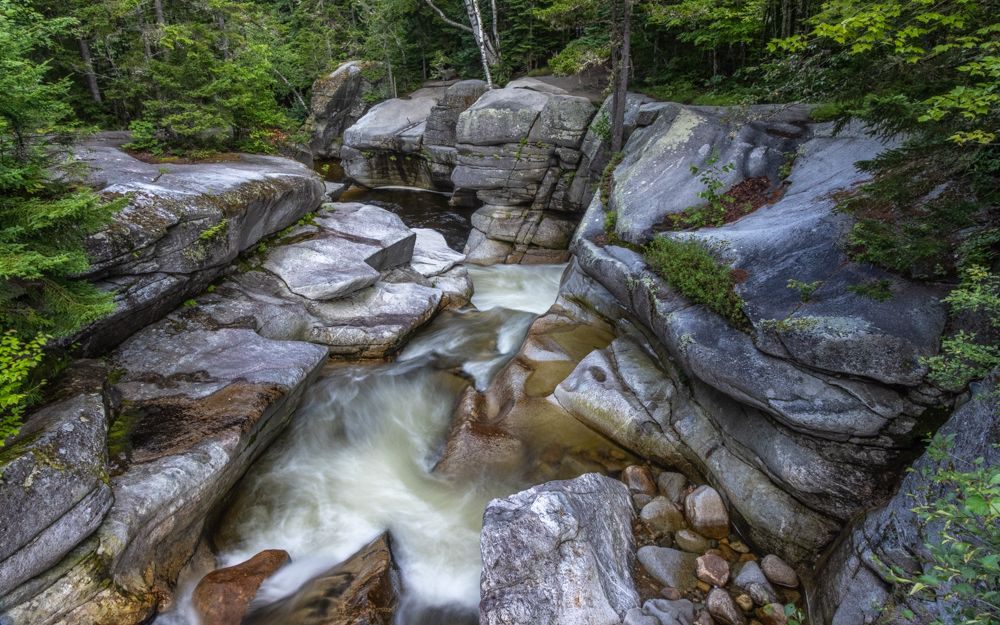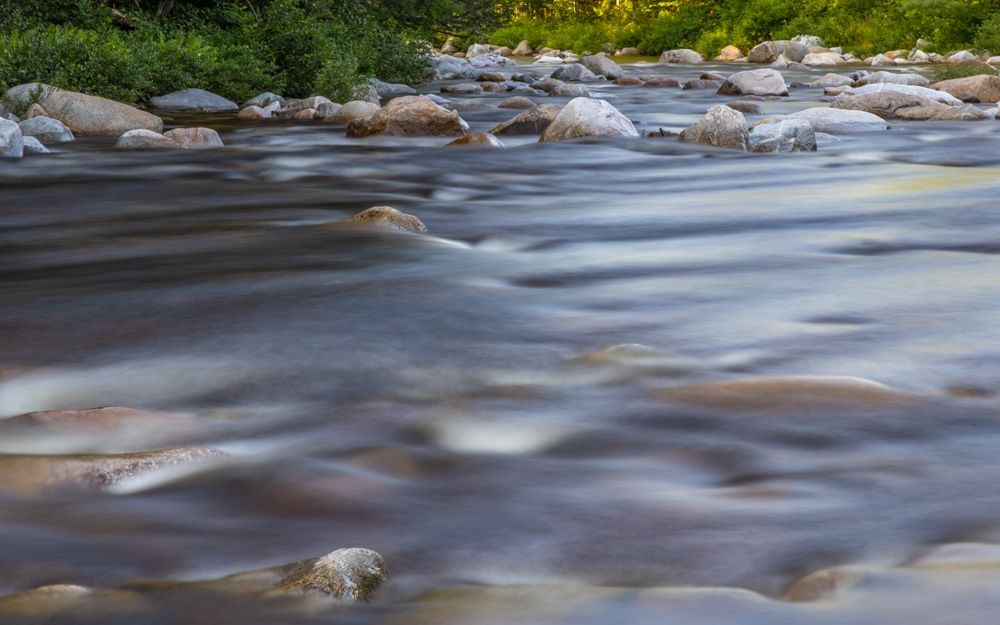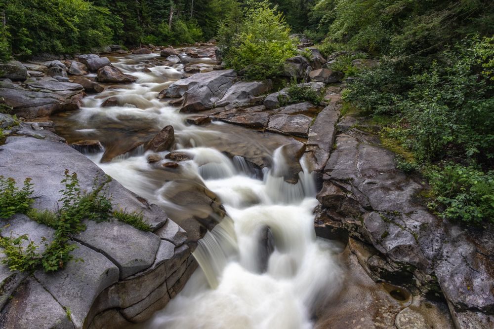 Flume Gorge . However, it turned out they operate on business hours - 9-5 and require another one of those pesky timed entrance tickets. I arrived at 4:50 and did not even try. I’m sure it is a stunning geographical feature, but those are lousy hours for photography anyway. I also did not try to photograph Lower Falls as it was overrun with people climbing in and around the area. Instead I pulled off the road and climbed down to an isolated spot to photograph a section of river that had fallen into shade. No moose, just a lot of signs to watch out for them.