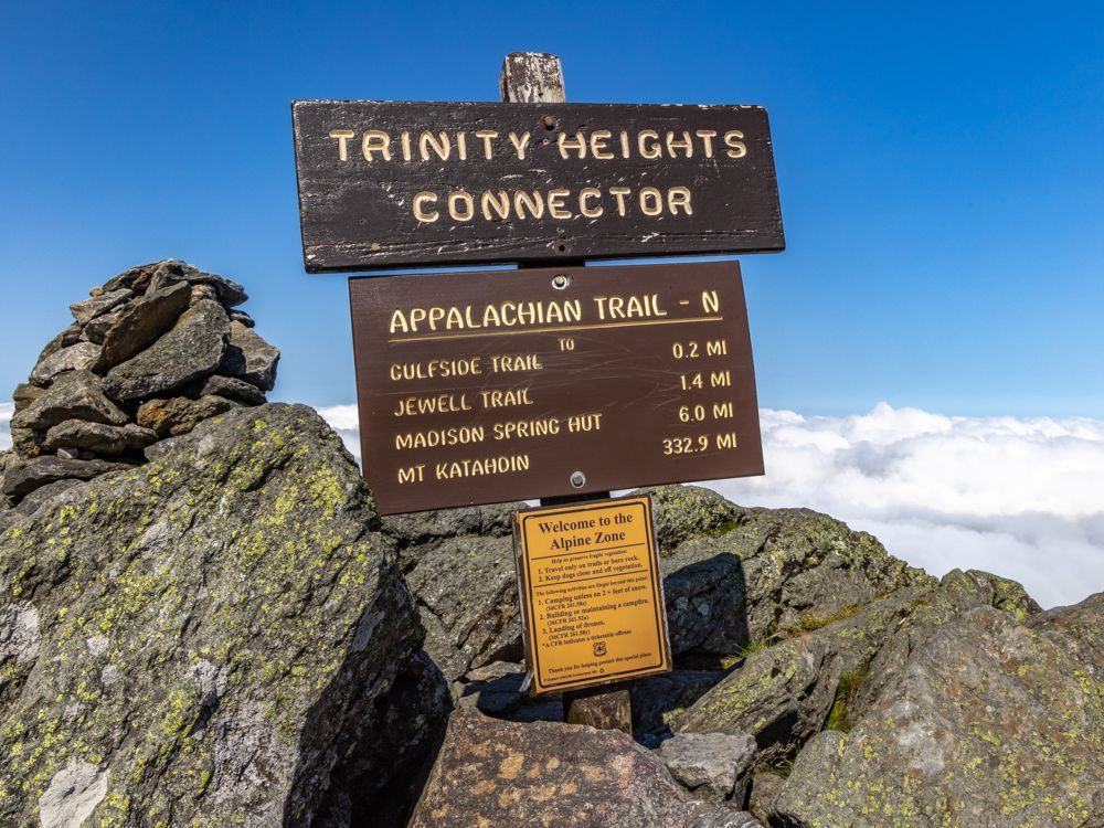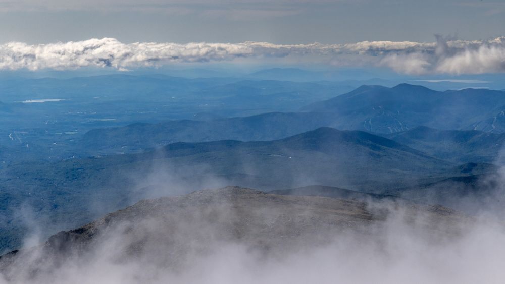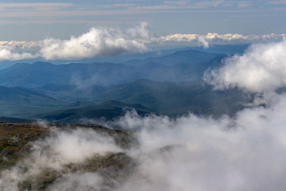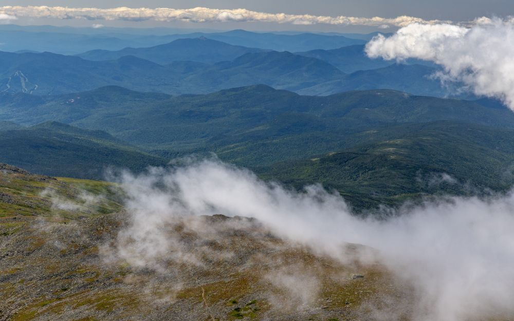 In theory one should be able to see into five states from the summit; in practice, even on a clear day, only one direction is visible, the rest is still obscured by scudding clouds. We had a clear view to the east, of, I think the Black Mountains. The Appalachian Trail also crosses Mount Washington and is reportedly one of the most difficult sections.