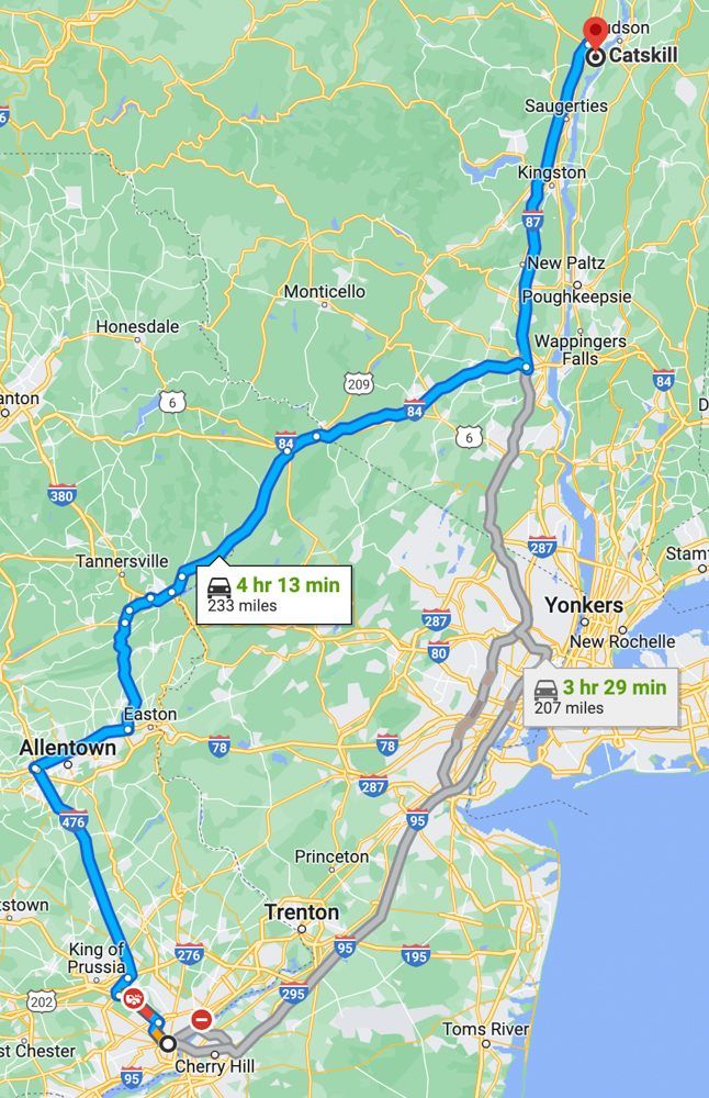 Philadelphia to Catskill (for some reason, Philadelphia is not named at the bottom of this map. You can see the I-95 closure - red dot with a line through it - just North of the named city of Cherry Hill. Philadelphia is the white dot just to the left.)