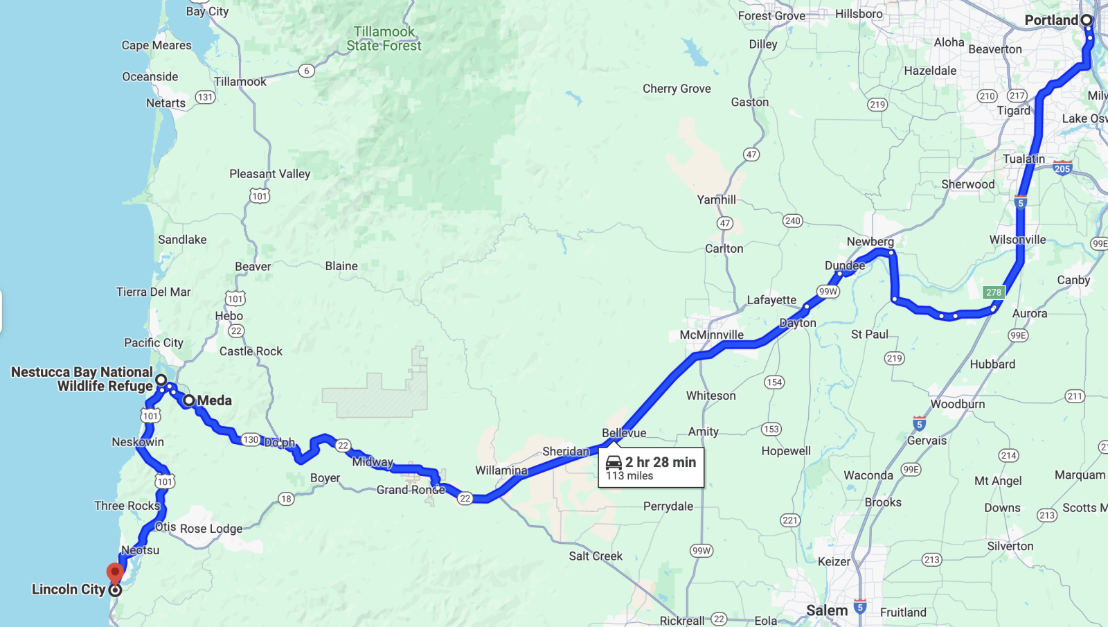 By midday I was back on the road, heading west to Lincoln city. I took the backroads and had identified a few of destinations that looked promising - a couple of water falls, a National Wildlife Refuge and an overlook. The waterfalls and overlook were a complete bust. At the locations where the waterfalls were reputed to be located on the side of the road, no waterfall was visible, nor a road or trail that might lead the them. The overlook would have required me to trespass on private property. I did find the National Wildlife Refuge, and took one of the short trails leading to a view of the Pacific. I did not have time at that point to hike the longer trails to a different viewpoint.