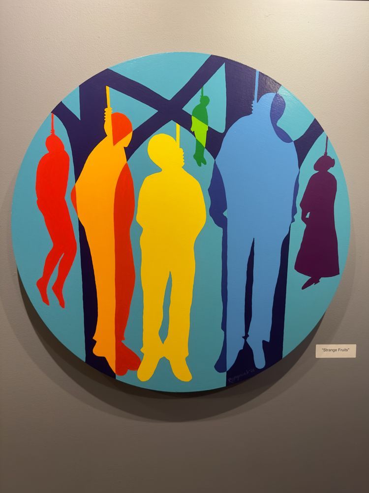 Richard Haynes . This is an evocative exhibit that tackles difficult subject matter through art. Although Haynes usually paints in vivid color, a large portion of this exhibition was black and white line drawings that specifically and deliberately excluded color. As I understood it, this was to convey the message in a colorblind fashion. A few of his color works also hung in the gallery, and a couple of them were particularly courageous. I normally don’t take photos of other peoples art, but I will include two of his paintings below (with permission from the person managing the gallery today). As an advisory, they are disturbing and may upset some people.