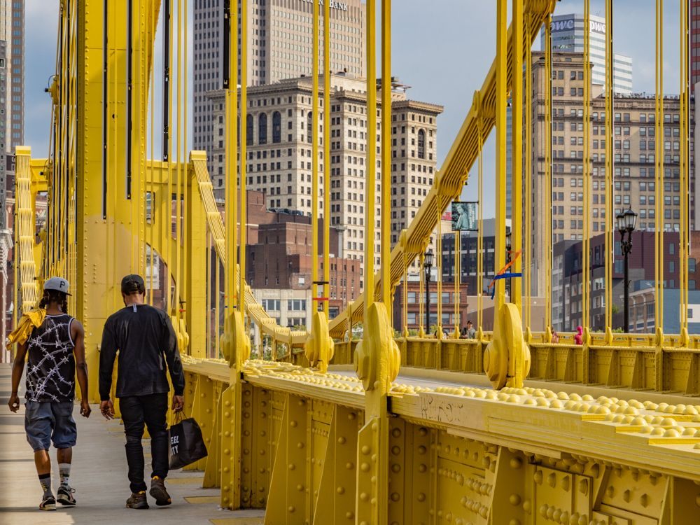 Pittsburgh skyline through the Rachel Carson bridge and a couple of pedestrians