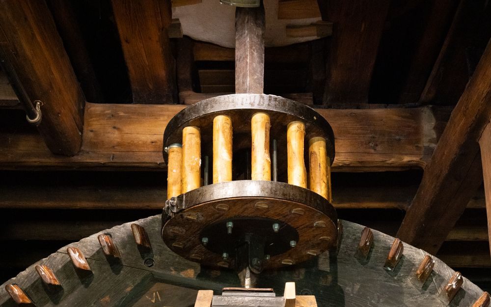 Jenny Grist Mill, gears below the large burr grinding stones on the floor above, Plymouth-Patuxet museums