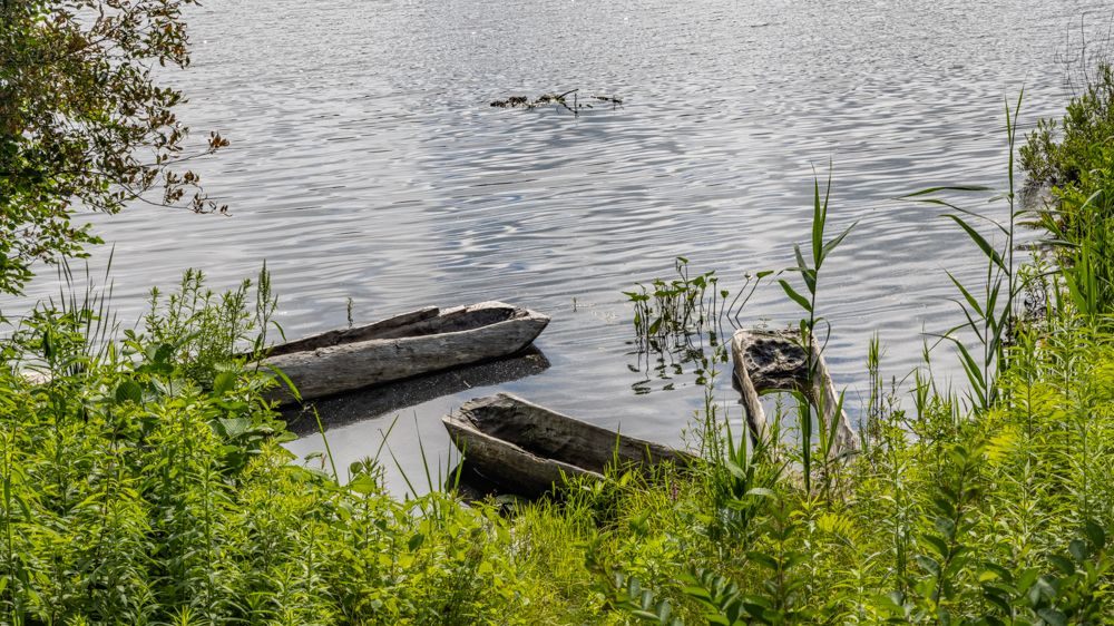 Wooden canoes on the river, Pawtuxet village, Plymouth-Patuxet museums