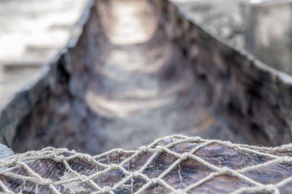 Netting and a wooden canoe, Patuxet village, Plymouth-Patuxet museums