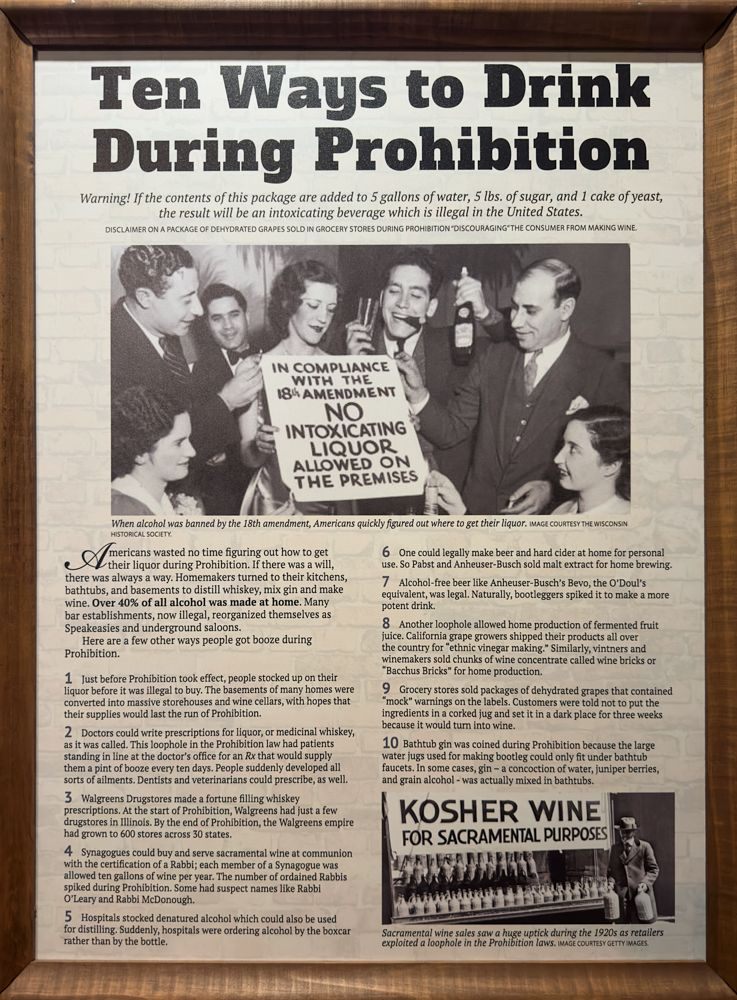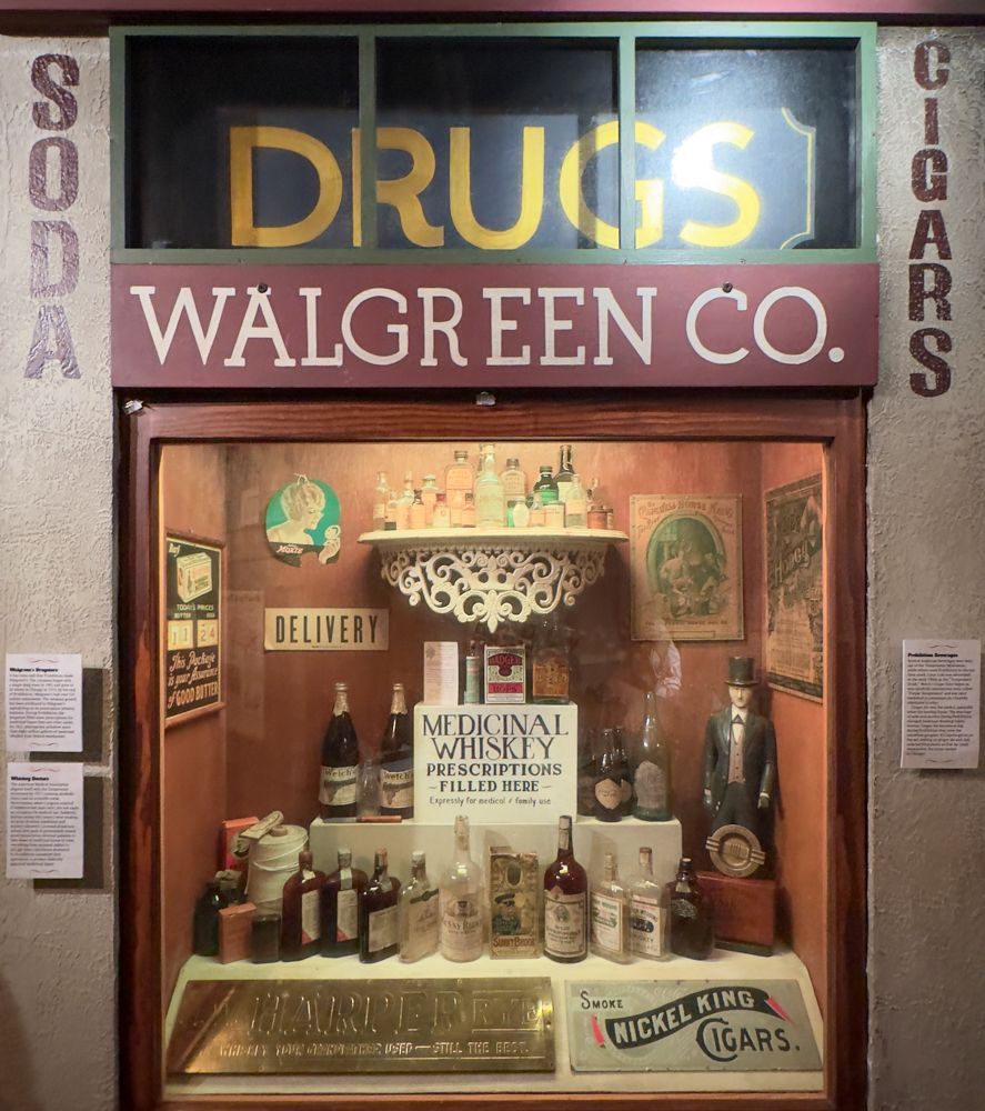 I learned quite a bit from this museum. For example, exceptions to the ban were made for “medicinal” and religious requirements. Sound familiar? Apparently the growth of Walgreens Drugstore (from a single store in 1901 to 525 by the end of prohibition) was largely due to their filling prescriptions for medicinal liquor. Coca Cola and Welch’s grape juice were advertised as temperance beverages and enjoyed substantial growth during that time. Synagogues and Jewish families could obtain a limited amount of sacramental wine. Apparently the number of ordained Rabbis spiked during prohibition, some with names like Rabbi O’Leary and Rabbi McDonough.