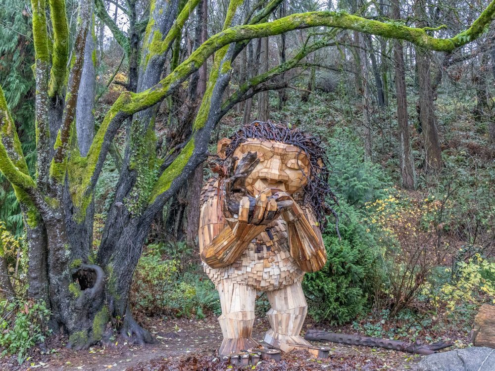There was a convenient break in the rain and I was finally able to take a walk around the neighborhood and down to the waterfront. My goal was to find one of the six troll sculptures that make up NWTrolls: Way of the Bird King.