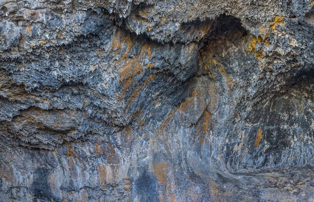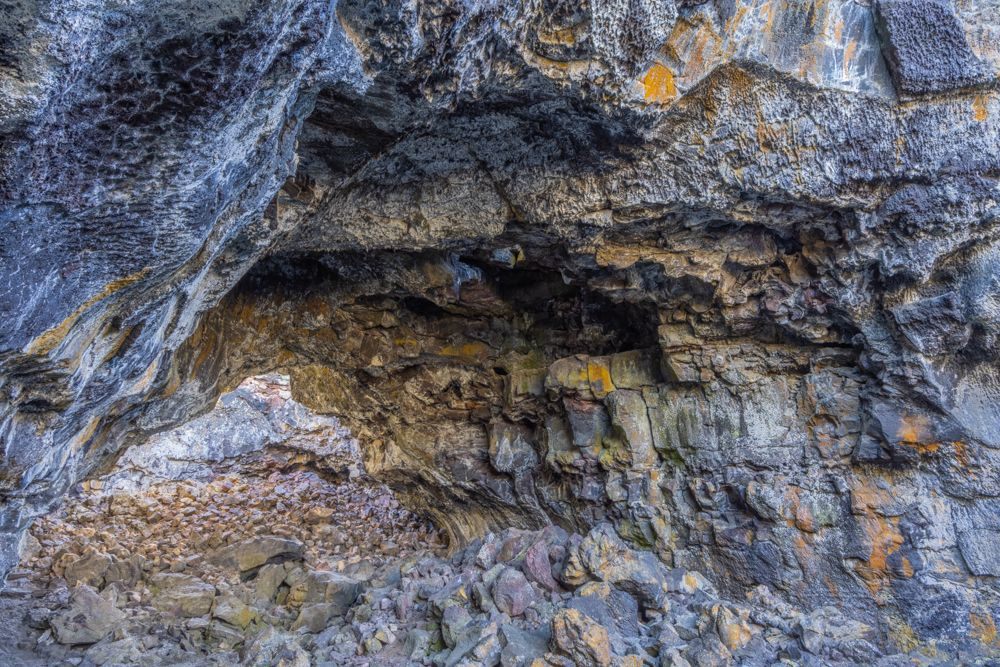 This morning I drove back out to Craters of the Moon National Monument. This area resulted from volcanic eruption and features lava flows with scattered islands of cinder cones and sagebrush. Although sun was predicted for the day, a low mist had settled in the valleys. After stopping to take a few photos along the way, I stopped at the Robert Limbert Visitor Center. The ranger there pointed me to particular spots of interest. She also set me up with a free cave permit to enter Indian tunnel, which she advised was the most photographically interesting. The free permit requirement was mostly to allow them to question you about previous cave visits within the last 10 years. They might as well have said ever. This is a stricter protocol than I have seen for trying to limit White-nose syndrome in bats. In spite of the fact that the last time I went through a cave, they had us walk through hydrogen peroxide, she said that was insufficient and asked me to wear different shoes and a different jacket. She assured me that my regular sneakers would be fine to visit the cave. And fortunately I had a lighter down jacket that would work for later in the day.