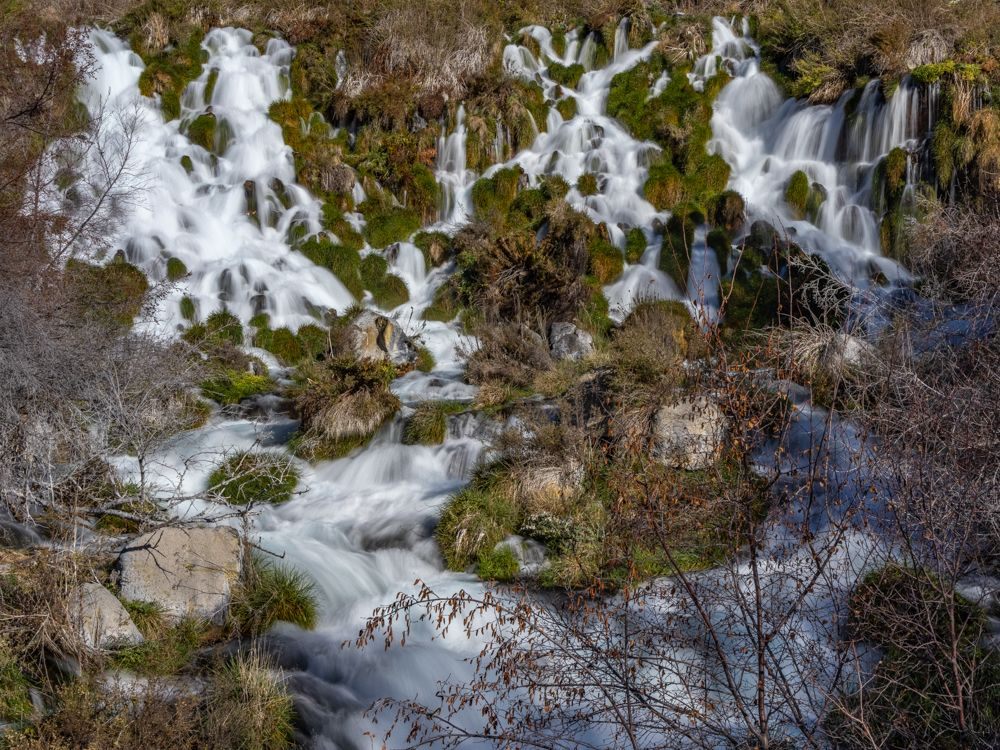 originates from a groundwater within the cliffs themselves . It results from snowmelt and precipitation that seeps into the porous lava planes that separate the Snake River from the Mountains. This water then emerges as a system of springs and waterfalls along the Snake River. Unfortunately, a tree, that is likely green in other seasons, but brown and spindly in the winter, sits right at the bottom of the falls. There is no other vantage point, so I took what I could get.