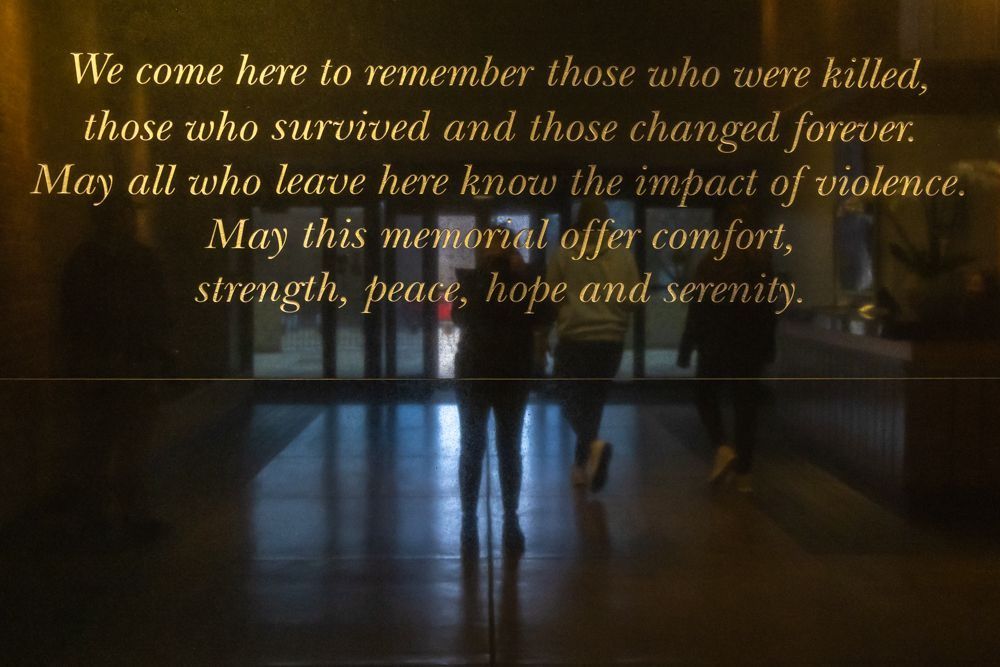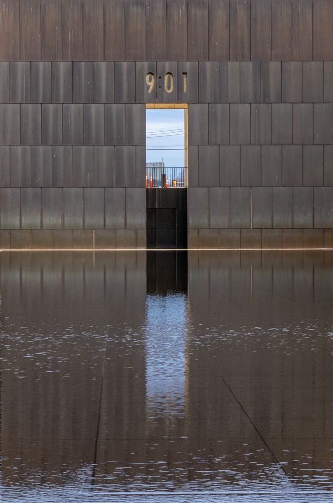 One end of the reflecting pool. 9:01 represents the innocence before the bombing, which took place at 9:02. The other end has an inscription of 9:03 to reflect the moment when healing began.